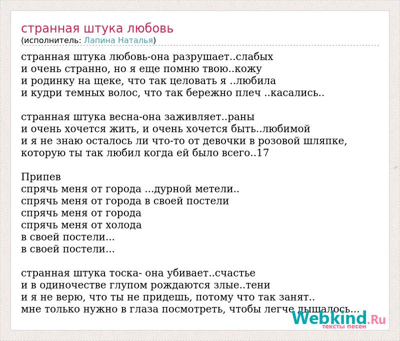 странная штука любовь-она разрушает..слабых и очень странно, но я еще помню твою..кожу и родинку на щеке, что так целовать я ..любила и кудри темных волос, что так бережно плеч ..касались.. странная штука весна-она заживляет..раны и очень хочется жить, и очень хочется быть..любимой и я не знаю осталось ли что-то от девочки в розовой шляпке, которую ты так любил когда ей было всего..17 Припев спрячь меня от города ...дурной метели.. спрячь меня от города в своей постели спрячь меня от города спрячь меня от холода в своей постели... в своей постели... странная штука тоска- она убивает..счастье и в одиночестве глупом рождаются злые..тени и я не верю, что ты не придешь, потому что так занят.. мне только нужно в глаза посмотреть, чтобы легче дышалось...