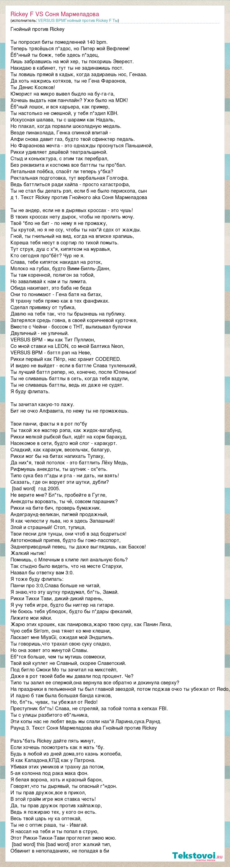 Гнойный против Rickey Ты попросил биты помедленней 140 bpm. Теперь трясёшься п*здос, но Питер мой Вефлеем! Ёб*нный ты бомж, тебе здесь п*здец, Лишь забравшись на мой хер, ты покоришь Эверест. Накидаю в кабинет, тут ты не задинамишь пост. Ты ловишь прямой в кадык, когда задираешь ноc, Генааа. Да хоть нажрись котяхов, ты не Гена Фараонов, Ты Денис Косяков! Юморист на микро вывел быдло на бу-га-га, Хочешь выдать нам панчлайн? Уже было на MDK! Ёб*ный лошок, и вся карьера, как пример, Ты настолько не смешной, у тебя п*здил КВН. Искуссная шалава, ты с шарами как Надаль, Но плакал, когда порвали шоколадную медаль. Везде пинаколада, Генка спинкой впитай - Алфи снова давит газ, будто твой сфинктер педаль. Но Фараонова мечта - это однажды проснуться Паньшиной, Рикки удивляет дешёвой театральщиной. Стыд и коньюктура, с этим так перебрал, Без реквизита и костюма все баттлы ты про*бал. Летальная поёбка, спасёт ли теперь у*бка? Ректальная подготовка, тут вербальная Голгофа. Ведь баттлиться ради хайпа - просто катастрофа, Ты не стал бы делать рэп, если б не было перископа, сын д 1. Текст Rickey против Гнойного aka Соня Мармеладова Ты не андер, если не в дырявых кроссах - это чушь! В твоих кроссах нету дырок, чтобы не пролить мочу. Твоё *бло не бит - по нему я не промажу, Ты крутой, но я не ссу, чтобы ты нах*й сдох от жажды. Гной, ты гнильный на вид, когда на вписке храпишь, Кореша тебя несут в сортир по тихой помыть. Тут струя, душ с х*я, кипятком на муравья, Кто сегодня про*бёт? Чур не я. Слава, тебе кипяток накидал на роток, Молоко на губах, будто Вимм-Билль-Данн, Ты там коренной, полигон за тобой, Но заваливай к нам и ты лимита. Обида накипает, это баба не беда Они то понимают - Гена батя на битах, Я трахну тебя прямо как в тех фанфиках. Сделал прививку от тубика, Давлю на тебя так, что ты брызнешь на публику. Затерялся средь говна, в своей коричневой курточке, Вместе с Чейни - боссом с ТНТ, вылизывал булочки Двуличный - не уличный. VERSUS BPM - мы как Тит Пуллион, Со мной ставки на LEON, со мной Балтика Neon, VERSUS BPM - бэттл рэп на Неве, Рикки первый как Пётр, нас хранит CODERED. И видео не выйдет - если в баттле Слава тухленький, Ты лучший баттл репер, но, конечно, после Юленьки! Ты не сливаешь баттлы в сеть, когда тебя вздули, Ты не сливаешь баттлы, ведь их даже не судят. Я буду флипать. Ты зачитал какую-то лажу. Бит не очко Алфавита, по нему ты не промажешь. Твои панчи, факты я в рот по*бу Ты такой же мастер рэпа, как жидок-вагабунд, Рикки мелкой рыбкой был, идёт на корм баракуд, Насекомое в сети, будто мой слог - каракурт. Сладкий, как каракум, весельчак, балагур, Рикки мог бы на битах напихать Тупаку, Да них*я, твой потолок - это баттлить Лёху Медь, Рифмуешь анекдоты, ты шутник - ох*еть. Типо сука без п*зды и рта - ни дать, ни взять! Сказать, где он ворует эти шутки, дубли? [bad word] год 2005. Не верите мне? Бл*ть, пробейте в Гугле, Анекдоты воровать, ты чё, совсем парашник? Рикки на бите бич, проверь бумажник. Андеграунд-великан, пигмей продажный, Я как челюсти у льва, но я здесь Запашный! Злой и страшный! Стоп, тупица, Твои песни для тунцы, они чтоб в зад бодриться! Автотюновый припев, будто бы гомо-пасспорт, Заднеприводный певец, ты даже выглядишь, как Басков! Жалкий нытик! Помнишь, с Млечным в клипе лил анальную боль? Так стыдно было видеть, что на месте Старухи, Назвал бы ответку вам 3:0. Я тоже буду флипать: Панчи про 3:0,Слава больше не читай, Я знаю,что эту ш