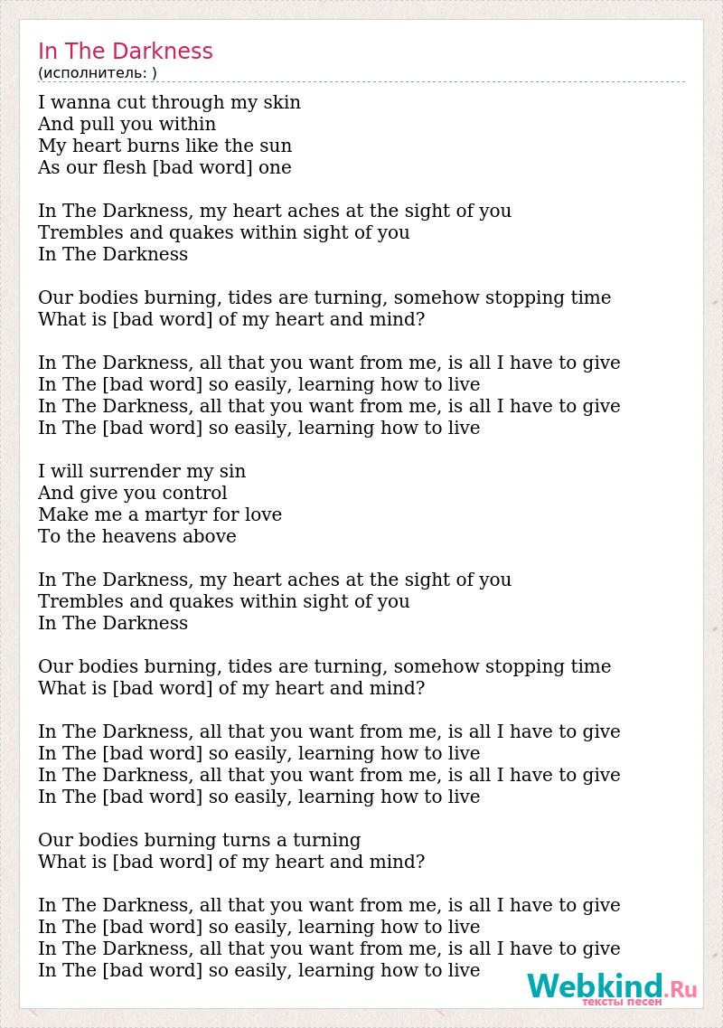 I wanna cut through my skin And pull you within My heart burns like the sun As our flesh [bad word] one In The Darkness, my heart aches at the sight of you Trembles and quakes within sight of you In The Darkness Our bodies burning, tides are turning, somehow stopping time What is [bad word] of my heart and mind? In The Darkness, all that you want from me, is all I have to give In The [bad word] so easily, learning how to live In The Darkness, all that you want from me, is all I have to give In The [bad word] so easily, learning how to live I will surrender my sin And give you control Make me a martyr for love To the heavens above In The Darkness, my heart aches at the sight of you Trembles and quakes within sight of you In The Darkness Our bodies burning, tides are turning, somehow stopping time What is [bad word] of my heart and mind? In The Darkness, all that you want from me, is all I have to give In The [bad word] so easily, learning how to live In The Darkness, all that you want from me, is all I have to give In The [bad word] so easily, learning how to live Our bodies burning turns a turning What is [bad word] of my heart and mind? In The Darkness, all that you want from me, is all I have to give In The [bad word] so easily, learning how to live In The Darkness, all that you want from me, is all I have to give In The [bad word] so easily, learning how to live