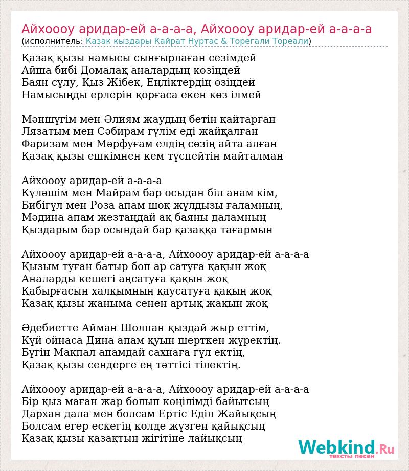 Қазақ қызы намысы сынғырлаған сезімдей Айша бибі Домалақ аналардың көзіңдей Баян сұлу, Қыз Жібек, Еңліктердің өзіңдей Намысыңды ерлерін қорғаса екен көз ілмей Мәншүгім мен Әлиям жаудың бетін қайтарған Лязатым мен Сәбирам гүлім еді жайқалған Фаризам мен Мәрфуғам елдің сөзің айта алған Қазақ қызы ешкімнен кем түспейтін майталман Айхоооу аридар-ей а-а-а-а Күләшім мен Майрам бар осыдан біл анам кім, Бибігүл мен Роза апам шоқ жұлдызы ғаламның, Мәдина апам жезтаңдай ақ баяны даламның Қыздарым бар осындай бар қазаққа тағармын Айхоооу аридар-ей а-а-а-а, Айхоооу аридар-ей а-а-а-а Қызым туған батыр боп ар сатуға қақын жоқ Аналарды кешегі аңсатуға қақын жоқ Қабырғасын халқымның қаусатуға қақың жоқ Қазақ қызы жаныма сенен артық жақын жоқ Әдебиетте Айман Шолпан қыздай жыр еттім, Күй ойнаса Дина апам қуын шерткен жүректің. Бүгін Мақпал апамдай сахнаға гүл ектің, Қазақ қызы сендерге ең тәттісі тілектің. Айхоооу аридар-ей а-а-а-а, Айхоооу аридар-ей а-а-а-а Бір қыз маған жар болып көңілімді байытсың Дархан дала мен болсам Ертіс Еділ Жайықсың Болсам егер ескегің көлде жүзген қайықсың Қазақ қызы қазақтың жігітіне лайықсың