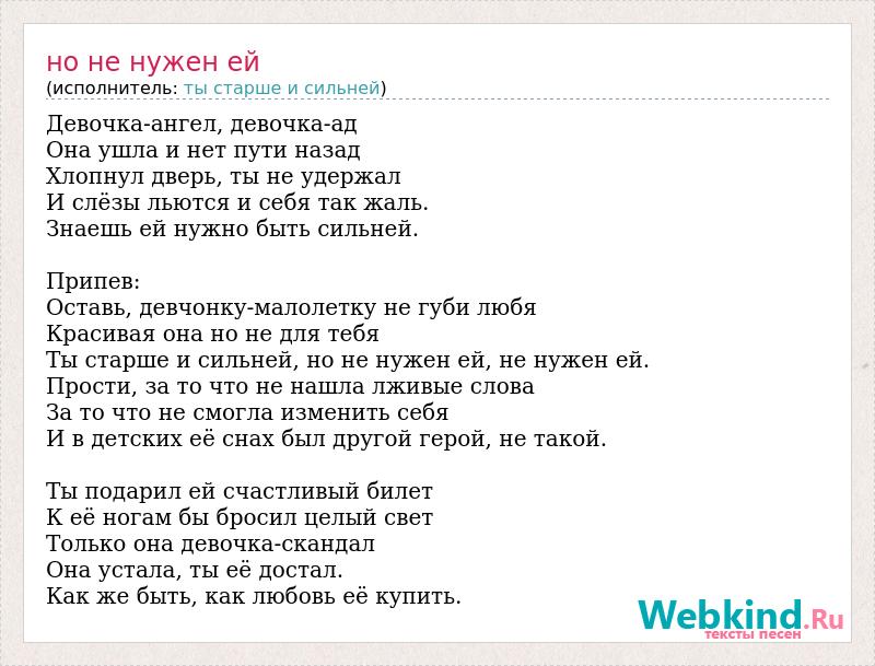 Девочка-ангел, девочка-ад Она ушла и нет пути назад Хлопнул дверь, ты не удержал И слёзы льются и себя так жаль. Знаешь ей нужно быть сильней. Припев: Оставь, девчонку-малолетку не губи любя Красивая она но не для тебя Ты старше и сильней, но не нужен ей, не нужен ей. Прости, за то что не нашла лживые слова За то что не смогла изменить себя И в детских её снах был другой герой, не такой. Ты подарил ей счастливый билет К её ногам бы бросил целый свет Только она девочка-скандал Она устала, ты её достал. Как же быть, как любовь её купить.