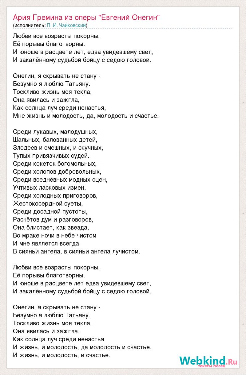 Любви все возрасты покорны, Её порывы благотворны. И юноше в расцвете лет, едва увидевшему свет, И закалённому судьбой бойцу с седою головой. Онегин, я скрывать не стану - Безумно я люблю Татьяну. Тоскливо жизнь моя текла, Она явилась и зажгла, Как солнца луч среди ненастья, Мне жизнь и молодость, да, молодость и счастье. Среди лукавых, малодушных, Шальных, балованных детей, Злодеев и смешных, и скучных, Тупых привязчивых судей. Среди кокеток богомольных, Среди холопов добровольных, Среди вседневных модных сцен, Учтивых ласковых измен. Среди холодных приговоров, Жестокосердной суеты, Среди досадной пустоты, Расчётов дум и разговоров, Она блистает, как звезда, Во мраке ночи в небе чистом И мне является всегда В сияньи ангела, в сияньи ангела лучистом. Любви все возрасты покорны, Её порывы благотворны. И юноше в расцвете лет едва увидевшему свет, И закалённому судьбой бойцу с седою головой. Онегин, я скрывать не стану - Безумно я люблю Татьяну. Тоскливо жизнь моя текла, Она явилась и зажгла. Как солнца луч среди ненастья И жизнь, и молодость, да молодость и счастье. И жизнь, и молодость, и счастье.