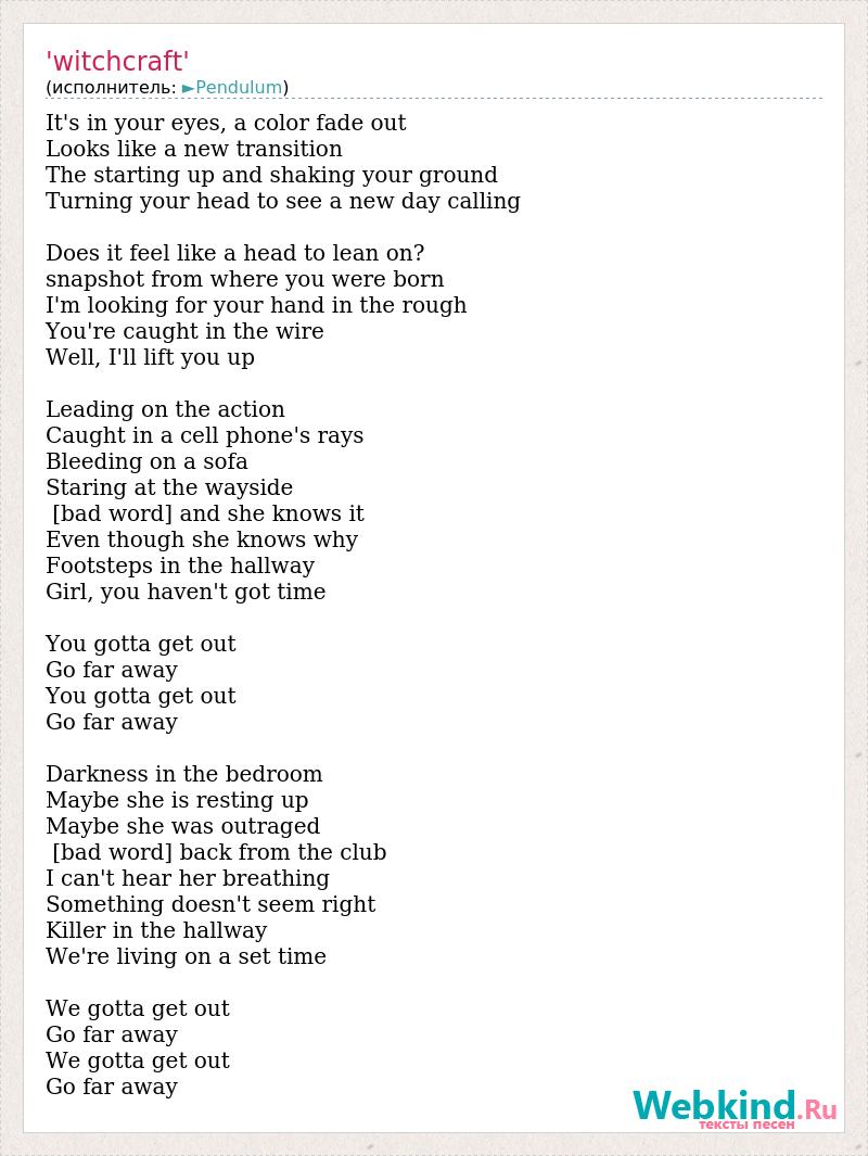 It's in your eyes, a color fade out Looks like a new transition The starting up and shaking your ground Turning your head to see a new day calling Does it feel like a head to lean on? snapshot from where you were born I'm looking for your hand in the rough You're caught in the wire Well, I'll lift you up Leading on the action Caught in a cell phone's rays Bleeding on a sofa Staring at the wayside [bad word] and she knows it Even though she knows why Footsteps in the hallway Girl, you haven't got time You gotta get out Go far away You gotta get out Go far away Darkness in the bedroom Maybe she is resting up Maybe she was outraged [bad word] back from the club I can't hear her breathing Something doesn't seem right Killer in the hallway We're living on a set time We gotta get out Go far away We gotta get out Go far away