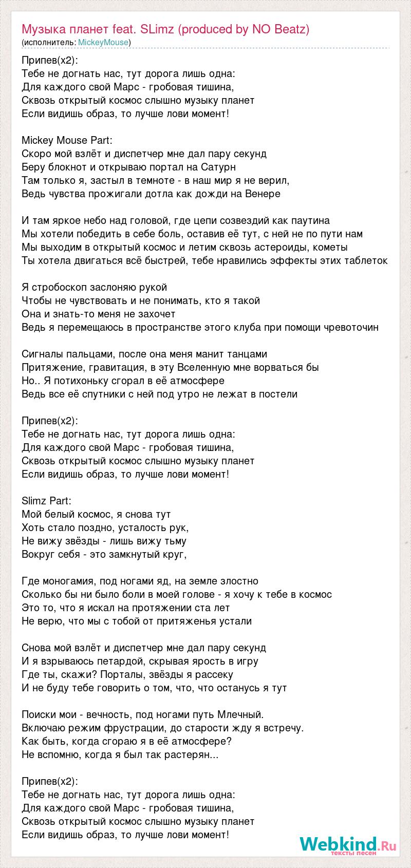 Припев(х2): Тебе не догнать нас, тут дорога лишь одна: Для каждого свой Марс - гробовая тишина, Сквозь открытый космос слышно музыку планет Если видишь образ, то лучше лови момент! Mickey Mouse Part: Скоро мой взлёт и диспетчер мне дал пару секунд Беру блокнот и открываю портал на Сатурн Там только я, застыл в темноте - в наш мир я не верил, Ведь чувства прожигали дотла как дожди на Венере И там яркое небо над головой, где цепи созвездий как паутина Мы хотели победить в себе боль, оставив её тут, с ней не по пути нам Мы выходим в открытый космос и летим сквозь астероиды, кометы Ты хотела двигаться всё быстрей, тебе нравились эффекты этих таблеток Я стробоскоп заслоняю рукой Чтобы не чувствовать и не понимать, кто я такой Она и знать-то меня не захочет Ведь я перемещаюсь в пространстве этого клуба при помощи чревоточин Сигналы пальцами, после она меня манит танцами Притяжение, гравитация, в эту Вселенную мне ворваться бы Но.. Я потихоньку сгорал в её атмосфере Ведь все её спутники с ней под утро не лежат в постели Припев(х2): Тебе не догнать нас, тут дорога лишь одна: Для каждого свой Марс - гробовая тишина, Сквозь открытый космос слышно музыку планет Если видишь образ, то лучше лови момент! Slimz Part: Мой белый космос, я снова тут Хоть стало поздно, усталость рук, Не вижу звёзды - лишь вижу тьму Вокруг себя - это замкнутый круг, Где моногамия, под ногами яд, на земле злостно Сколько бы ни было боли в моей голове - я хочу к тебе в космос Это то, что я искал на протяжении ста лет Не верю, что мы с тобой от притяженья устали Снова мой взлёт и диспетчер мне дал пару секунд И я взрываюсь петардой, скрывая ярость в игру Где ты, скажи? Порталы, звёзды я рассеку И не буду тебе говорить о том, что, что останусь я тут Поиски мои - вечность, под ногами путь Млечный. Включаю режим фрустрации, до старости жду я встречу. Как быть, когда сгораю я в её атмосфере? Не вспомню, когда я был так растерян... Припев(х2): Тебе не догнать нас, тут дорога лишь одна: Для каждого свой Марс - гробовая тишина, Сквозь открытый космос слышно музыку планет Если видишь образ, то лучше лови момент!