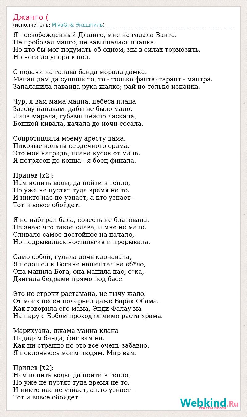 Я - освобожденный Джанго, мне не гадала Ванга. Не пробовал манго, не завышалась планка. Но кто бы мог подумать об одном, мы в силах тормозить, Но нога до упора в пол. С подачи на галава банда морала дамка. Манан дам да сушняк то, то - только фанта; гарант - мантра. Запаланила лаванда рука жалко; рай но только изнанка. Чур, я вам мама манна, небеса плана Зазову папавам, дабы не было мало. Липа марала, губами нежно ласкала, Бошкой кивала, качала до ночи сосала. Сопротивляла моему аресту дама. Пиковые вольты сердечного срама. Это моя награда, плана кусок от мала. Я потрясен до конца - я боец финала. Припев [x2]: Нам испить воды, да пойти в тепло, Но уже не пустят туда время не то. И никто нас не узнает, а кто узнает - Тот и вовсе обойдет. Я не набирал бала, совесть не блатовала. Не знаю что такое слава, и мне не мало. Сливало самое достойное на начало, Но подрывалась ностальгия и прерывала. Само собой, гуляла дочь карнавала, Я подошел к Богине нашептал на еб*ло, Она манила Бога, она манила нас, с*ка, Двигала бедрами прямо под басс. Это не строки растамана, не тычу жало. От моих песен почернел даже Барак Обама. Как говорила его мама, Энди Фалау ма На пару с Бобом проходил мимо раста храма. Марихуана, джама манна клана Пададам банда, фиг вам на. Как ни странно но это все очень забавно. Я поклоняюсь моим людям. Мир вам. Припев [x2]: Нам испить воды, да пойти в тепло, Но уже не пустят туда время не то. И никто нас не узнает, а кто узнает - Тот и вовсе обойдет.