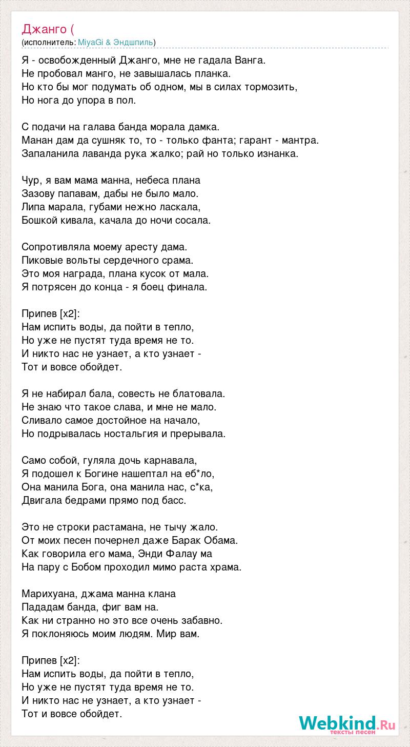 Я - освобожденный Джанго, мне не гадала Ванга. Не пробовал манго, не завышалась планка. Но кто бы мог подумать об одном, мы в силах тормозить, Но нога до упора в пол. С подачи на галава банда морала дамка. Манан дам да сушняк то, то - только фанта; гарант - мантра. Запаланила лаванда рука жалко; рай но только изнанка. Чур, я вам мама манна, небеса плана Зазову папавам, дабы не было мало. Липа марала, губами нежно ласкала, Бошкой кивала, качала до ночи сосала. Сопротивляла моему аресту дама. Пиковые вольты сердечного срама. Это моя награда, плана кусок от мала. Я потрясен до конца - я боец финала. Припев [x2]: Нам испить воды, да пойти в тепло, Но уже не пустят туда время не то. И никто нас не узнает, а кто узнает - Тот и вовсе обойдет. Я не набирал бала, совесть не блатовала. Не знаю что такое слава, и мне не мало. Сливало самое достойное на начало, Но подрывалась ностальгия и прерывала. Само собой, гуляла дочь карнавала, Я подошел к Богине нашептал на еб*ло, Она манила Бога, она манила нас, с*ка, Двигала бедрами прямо под басс. Это не строки растамана, не тычу жало. От моих песен почернел даже Барак Обама. Как говорила его мама, Энди Фалау ма На пару с Бобом проходил мимо раста храма. Марихуана, джама манна клана Пададам банда, фиг вам на. Как ни странно но это все очень забавно. Я поклоняюсь моим людям. Мир вам. Припев [x2]: Нам испить воды, да пойти в тепло, Но уже не пустят туда время не то. И никто нас не узнает, а кто узнает - Тот и вовсе обойдет.