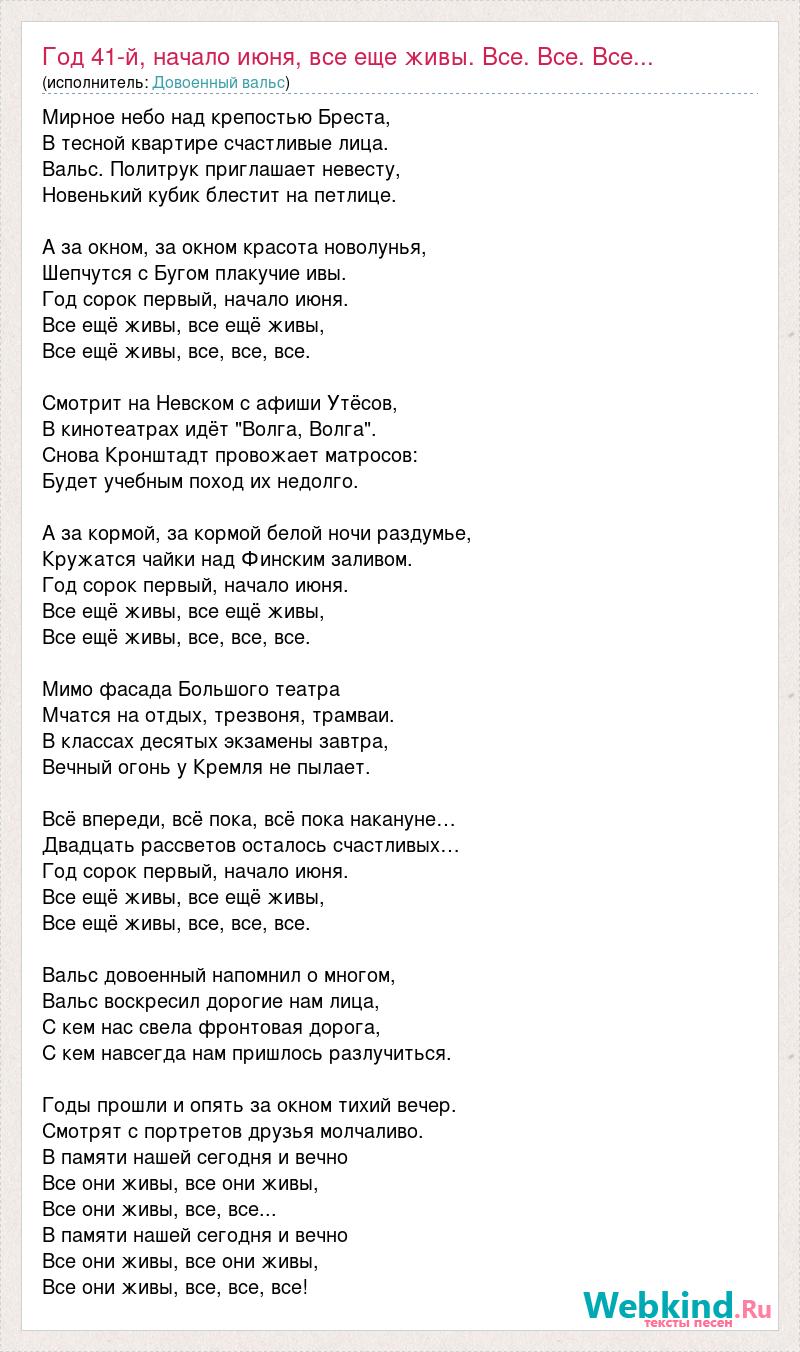 Мирное небо над крепостью Бреста, В тесной квартире счастливые лица. Вальс. Политрук приглашает невесту, Новенький кубик блестит на петлице. А за окном, за окном красота новолунья, Шепчутся с Бугом плакучие ивы. Год сорок первый, начало июня. Все ещё живы, все ещё живы, Все ещё живы, все, все, все. Смотрит на Невском с афиши Утёсов, В кинотеатрах идёт "Волга, Волга". Снова Кронштадт провожает матросов: Будет учебным поход их недолго. А за кормой, за кормой белой ночи раздумье, Кружатся чайки над Финским заливом. Год сорок первый, начало июня. Все ещё живы, все ещё живы, Все ещё живы, все, все, все. Мимо фасада Большого театра Мчатся на отдых, трезвоня, трамваи. В классах десятых экзамены завтра, Вечный огонь у Кремля не пылает. Всё впереди, всё пока, всё пока накануне… Двадцать рассветов осталось счастливых… Год сорок первый, начало июня. Все ещё живы, все ещё живы, Все ещё живы, все, все, все. Вальс довоенный напомнил о многом, Вальс воскресил дорогие нам лица, С кем нас свела фронтовая дорога, С кем навсегда нам пришлось разлучиться. Годы прошли и опять за окном тихий вечер. Смотрят с портретов друзья молчаливо. В памяти нашей сегодня и вечно Все они живы, все они живы, Все они живы, все, все... В памяти нашей сегодня и вечно Все они живы, все они живы, Все они живы, все, все, все!