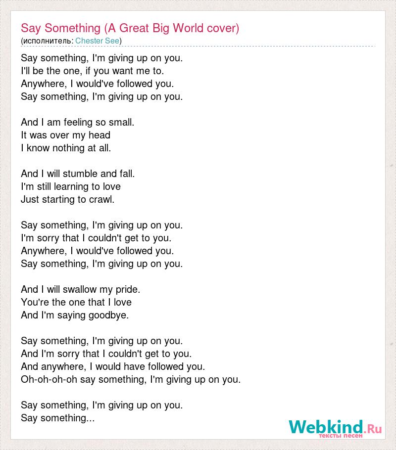 Say something, I'm giving up on you. I'll be the one, if you want me to. Anywhere, I would've followed you. Say something, I'm giving up on you. And I am feeling so small. It was over my head I know nothing at all. And I will stumble and fall. I'm still learning to love Just starting to crawl. Say something, I'm giving up on you. I'm sorry that I couldn't get to you. Anywhere, I would've followed you. Say something, I'm giving up on you. And I will swallow my pride. You're the one that I love And I'm saying goodbye. Say something, I'm giving up on you. And I'm sorry that I couldn't get to you. And anywhere, I would have followed you. Oh-oh-oh-oh say something, I'm giving up on you. Say something, I'm giving up on you. Say something...