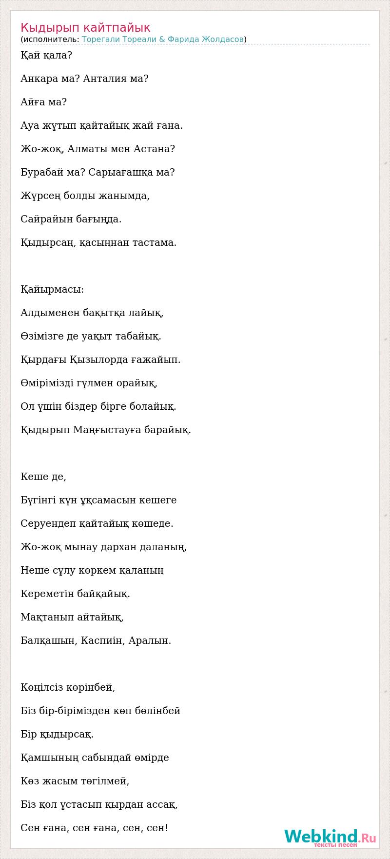 Қай қала? Анкара ма? Анталия ма? Айға ма? Ауа жұтып қайтайық жай ғана. Жо-жоқ, Алматы мен Астана? Бурабай ма? Сарыағашқа ма? Жүрсең болды жанымда, Сайрайын бағыңда. Қыдырсаң, қасыңнан тастама. Қайырмасы: Алдыменен бақытқа лайық, Өзімізге де уақыт табайық. Қырдағы Қызылорда ғажайып. Өмірімізді гүлмен орайық, Ол үшін біздер бірге болайық. Қыдырып Маңғыстауға барайық. Кеше де, Бүгінгі күн ұқсамасын кешеге Серуендеп қайтайық көшеде. Жо-жоқ мынау дархан даланың, Неше сұлу көркем қаланың Кереметін байқайық. Мақтанып айтайық, Балқашын, Каспиін, Аралын. Көңілсіз көрінбей, Біз бір-бірімізден көп бөлінбей Бір қыдырсақ. Қамшының сабындай өмірде Көз жасым төгілмей, Біз қол ұстасып қырдан ассақ, Сен ғана, сен ғана, сен, сен!