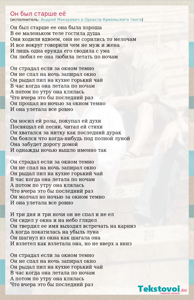 Он был старше ее она была хороша В ее маленьком теле гостила душа Они ходили вдвоем, они не сорились то мелочам И все вокруг говорили чем не муж и жена И лишь одна ерунда его сводила с ума Он любил ее она любила летать по ночам Он страдал если за окном темно Он не спал на ночь запирал окно Он рыдал пил на кухне горький чай В час когда она летала по ночам А потом по утру она клялась Что вчера это бы последний раз Он прощал но ночью за окном темно И она улетала все ровно Он носил ей розы, покупал ей духи Посвящал ей песни, читал ей стихи Он хватался за нитку как последний дурак Он боялся что когда-нибудь под полной луной Она забудет дорогу домой И однажды ночью вышло именно так Он страдал если за окном темно Он не спал на ночь запирал окно Он рыдал пил на кухне горький чай В час когда она летала по ночам А потом по утру она клялась Что вчера это бы последний раз Он молчал но ночью за окном темно И она улетала все ровно И три дня и три ночи он не спал и не ел Он сидел у окна и на небо глядел Он твердил ее имя выходил встречать на карниз А когда покатилась на убыль луна Он шагнул из окна как шагала она И взлетел как взлетала она, но не вверх а вниз Он страдал если за окном темно Он не спал на ночь запирал окно Он рыдал пил на кухне горький чай В час когда она летала по ночам А потом по утру она клялась Что вчера это бы последний раз