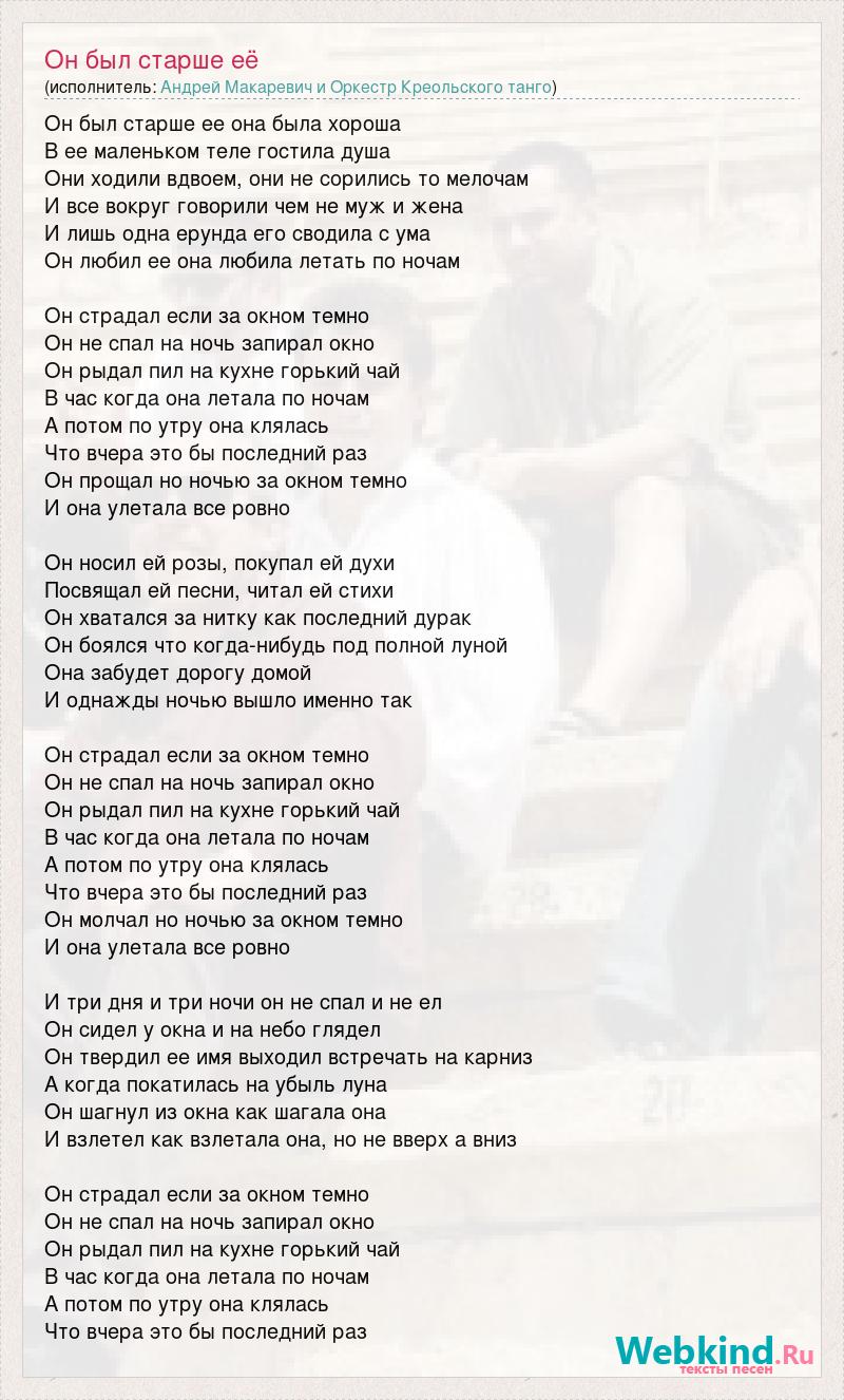 Он был старше ее она была хороша В ее маленьком теле гостила душа Они ходили вдвоем, они не сорились то мелочам И все вокруг говорили чем не муж и жена И лишь одна ерунда его сводила с ума Он любил ее она любила летать по ночам Он страдал если за окном темно Он не спал на ночь запирал окно Он рыдал пил на кухне горький чай В час когда она летала по ночам А потом по утру она клялась Что вчера это бы последний раз Он прощал но ночью за окном темно И она улетала все ровно Он носил ей розы, покупал ей духи Посвящал ей песни, читал ей стихи Он хватался за нитку как последний дурак Он боялся что когда-нибудь под полной луной Она забудет дорогу домой И однажды ночью вышло именно так Он страдал если за окном темно Он не спал на ночь запирал окно Он рыдал пил на кухне горький чай В час когда она летала по ночам А потом по утру она клялась Что вчера это бы последний раз Он молчал но ночью за окном темно И она улетала все ровно И три дня и три ночи он не спал и не ел Он сидел у окна и на небо глядел Он твердил ее имя выходил встречать на карниз А когда покатилась на убыль луна Он шагнул из окна как шагала она И взлетел как взлетала она, но не вверх а вниз Он страдал если за окном темно Он не спал на ночь запирал окно Он рыдал пил на кухне горький чай В час когда она летала по ночам А потом по утру она клялась Что вчера это бы последний раз