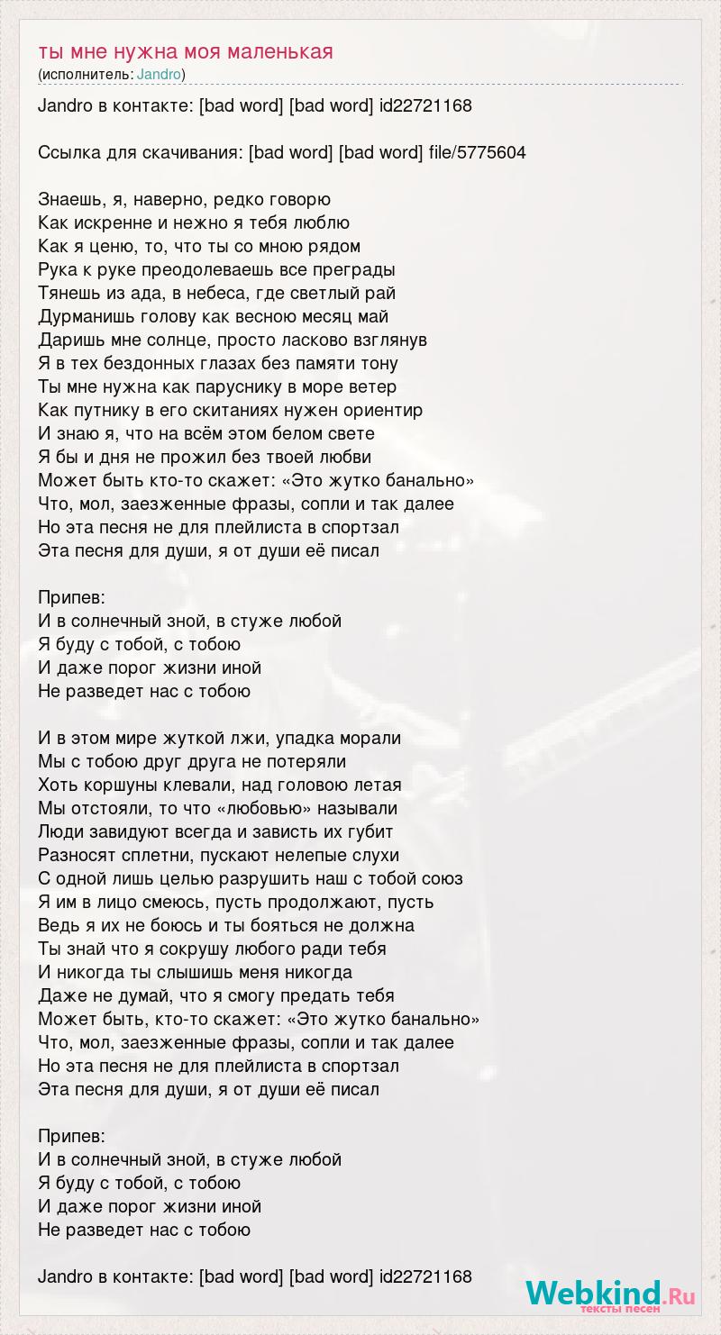 Jandro в контакте: [bad word] [bad word] id22721168 Ссылка для скачивания: [bad word] [bad word] file/5775604 Знаешь, я, наверно, редко говорю Как искренне и нежно я тебя люблю Как я ценю, то, что ты со мною рядом Рука к руке преодолеваешь все преграды Тянешь из ада, в небеса, где светлый рай Дурманишь голову как весною месяц май Даришь мне солнце, просто ласково взглянув Я в тех бездонных глазах без памяти тону Ты мне нужна как паруснику в море ветер Как путнику в его скитаниях нужен ориентир И знаю я, что на всём этом белом свете Я бы и дня не прожил без твоей любви Может быть кто-то скажет: «Это жутко банально» Что, мол, заезженные фразы, сопли и так далее Но эта песня не для плейлиста в спортзал Эта песня для души, я от души её писал Припев: И в солнечный зной, в стуже любой Я буду с тобой, с тобою И даже порог жизни иной Не разведет нас с тобою И в этом мире жуткой лжи, упадка морали Мы с тобою друг друга не потеряли Хоть коршуны клевали, над головою летая Мы отстояли, то что «любовью» называли Люди завидуют всегда и зависть их губит Разносят сплетни, пускают нелепые слухи С одной лишь целью разрушить наш с тобой союз Я им в лицо смеюсь, пусть продолжают, пусть Ведь я их не боюсь и ты бояться не должна Ты знай что я сокрушу любого ради тебя И никогда ты слышишь меня никогда Даже не думай, что я смогу предать тебя Может быть, кто-то скажет: «Это жутко банально» Что, мол, заезженные фразы, сопли и так далее Но эта песня не для плейлиста в спортзал Эта песня для души, я от души её писал Припев: И в солнечный зной, в стуже любой Я буду с тобой, с тобою И даже порог жизни иной Не разведет нас с тобою Jandro в контакте: [bad word] [bad word] id22721168