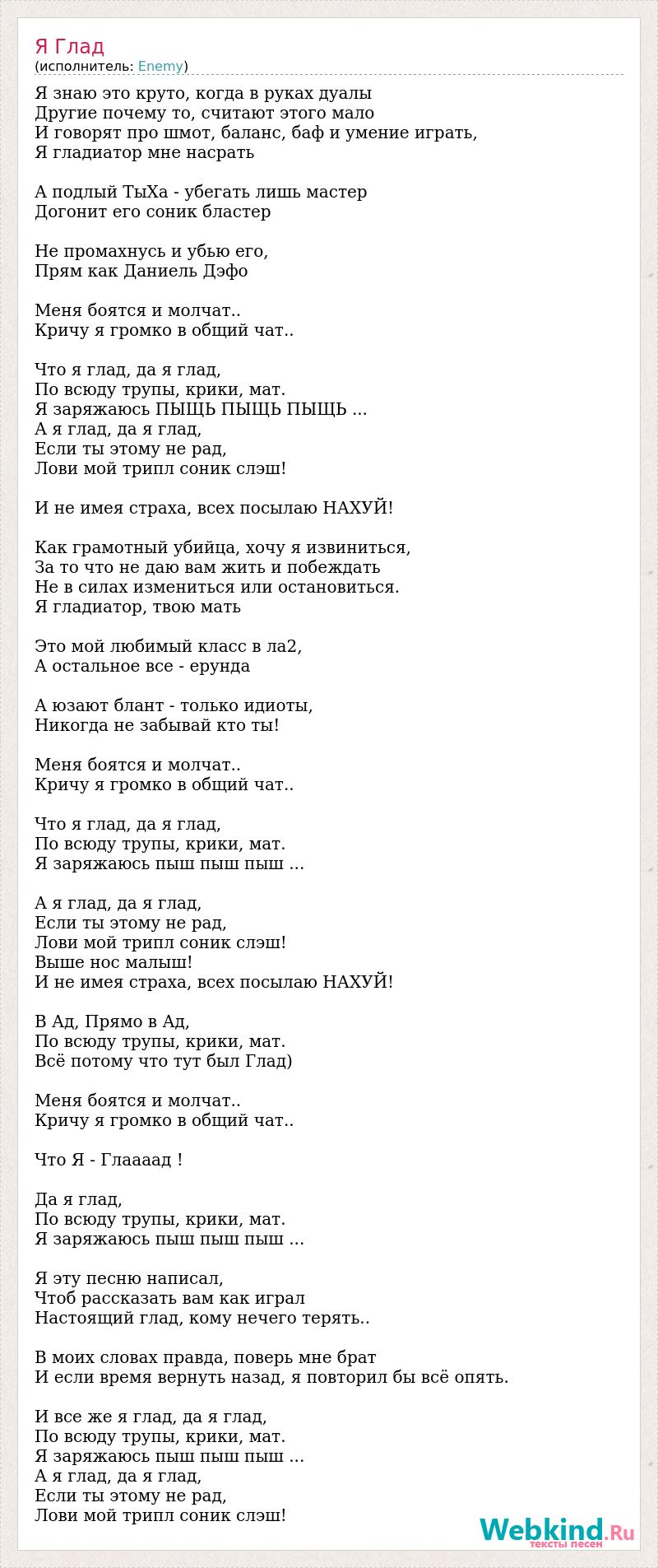 Я знаю это круто, когда в руках дуалы Другие почему то, считают этого мало И говорят про шмот, баланс, баф и умение играть, Я гладиатор мне насрать А подлый ТыХа - убегать лишь мастер Догонит его соник бластер Не промахнусь и убью его, Прям как Даниель Дэфо Меня боятся и молчат.. Кричу я громко в общий чат.. Что я глад, да я глад, По всюду трупы, крики, мат. Я заряжаюсь ПЫЩЬ ПЫЩЬ ПЫЩЬ ... А я глад, да я глад, Если ты этому не рад, Лови мой трипл соник слэш! И не имея страха, всех посылаю НАХУЙ! Как грамотный убийца, хочу я извиниться, За то что не даю вам жить и побеждать Не в силах измениться или остановиться. Я гладиатор, твою мать Это мой любимый класс в ла2, А остальное все - ерунда А юзают блант - только идиоты, Никогда не забывай кто ты! Меня боятся и молчат.. Кричу я громко в общий чат.. Что я глад, да я глад, По всюду трупы, крики, мат. Я заряжаюсь пыш пыш пыш ... А я глад, да я глад, Если ты этому не рад, Лови мой трипл соник слэш! Выше нос малыш! И не имея страха, всех посылаю НАХУЙ! В Ад, Прямо в Ад, По всюду трупы, крики, мат. Всё потому что тут был Глад) Меня боятся и молчат.. Кричу я громко в общий чат.. Что Я - Глаааад ! Да я глад, По всюду трупы, крики, мат. Я заряжаюсь пыш пыш пыш ... Я эту песню написал, Чтоб рассказать вам как играл Настоящий глад, кому нечего терять.. В моих словах правда, поверь мне брат И если время вернуть назад, я повторил бы всё опять. И все же я глад, да я глад, По всюду трупы, крики, мат. Я заряжаюсь пыш пыш пыш ... А я глад, да я глад, Если ты этому не рад, Лови мой трипл соник слэш!