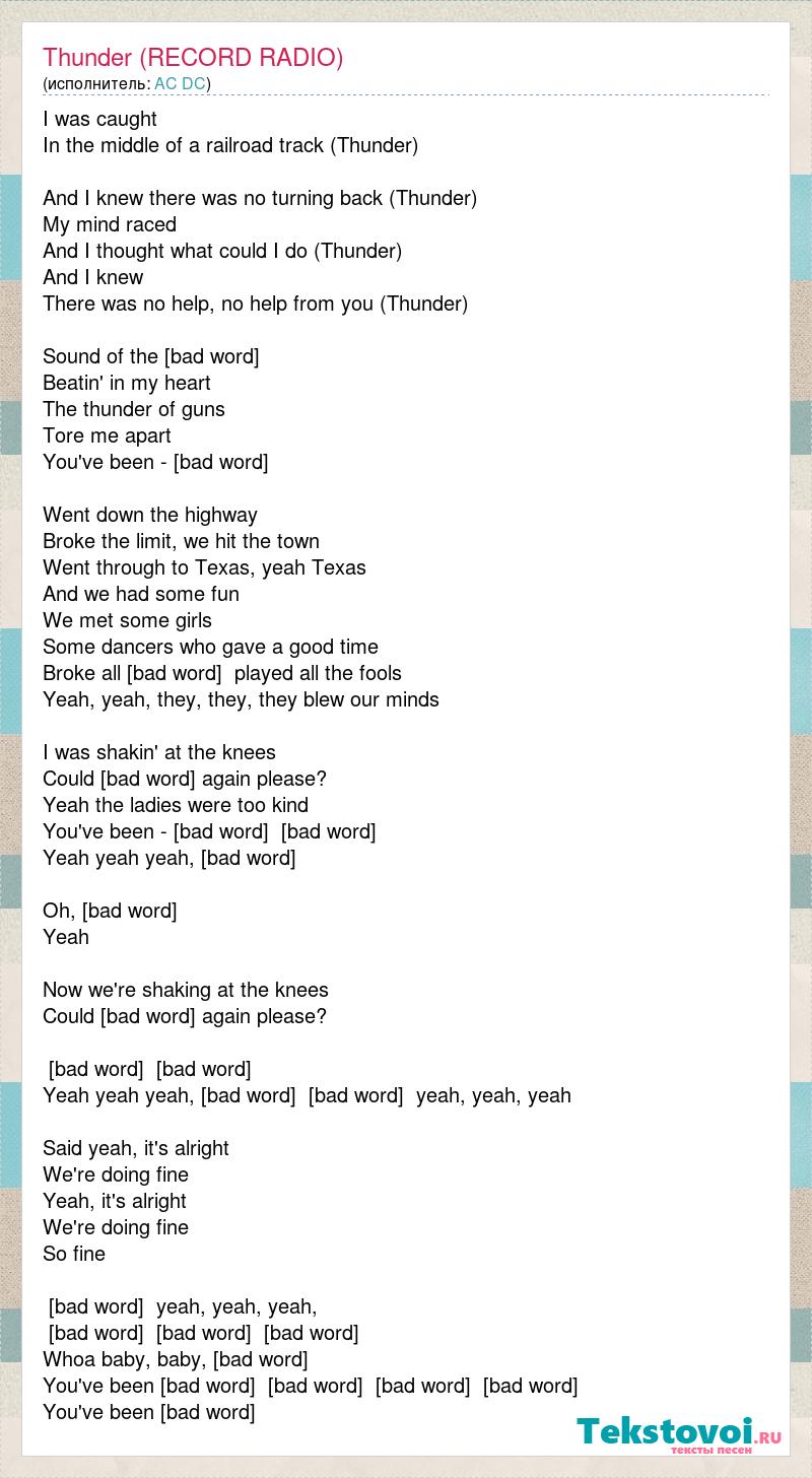 I was caught In the middle of a railroad track (Thunder) And I knew there was no turning back (Thunder) My mind raced And I thought what could I do (Thunder) And I knew There was no help, no help from you (Thunder) Sound of the [bad word] Beatin' in my heart The thunder of guns Tore me apart You've been - [bad word] Went down the highway Broke the limit, we hit the town Went through to Texas, yeah Texas And we had some fun We met some girls Some dancers who gave a good time Broke all [bad word] played all the fools Yeah, yeah, they, they, they blew our minds I was shakin' at the knees Could [bad word] again please? Yeah the ladies were too kind You've been - [bad word] [bad word] Yeah yeah yeah, [bad word] Oh, [bad word] Yeah Now we're shaking at the knees Could [bad word] again please? [bad word] [bad word] Yeah yeah yeah, [bad word] [bad word] yeah, yeah, yeah Said yeah, it's alright We're doing fine Yeah, it's alright We're doing fine So fine [bad word] yeah, yeah, yeah, [bad word] [bad word] [bad word] Whoa baby, baby, [bad word] You've been [bad word] [bad word] [bad word] [bad word] You've been [bad word]