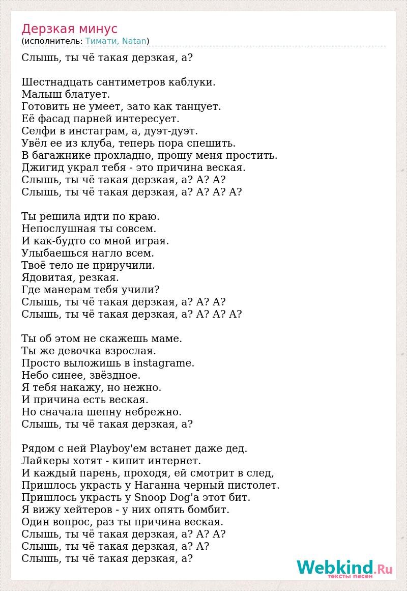 Слышь, ты чё такая дерзкая, а? Шестнадцать сантиметров каблуки. Малыш блатует. Готовить не умеет, зато как танцует. Её фасад парней интересует. Селфи в инстаграм, а, дуэт-дуэт. Увёл ее из клуба, теперь пора спешить. В багажнике прохладно, прошу меня простить. Джигид украл тебя - это причина веская. Слышь, ты чё такая дерзкая, а? А? А? Слышь, ты чё такая дерзкая, а? А? А? А? Ты решила идти по краю. Непослушная ты совсем. И как-будто со мной играя. Улыбаешься нагло всем. Твоё тело не приручили. Ядовитая, резкая. Где манерам тебя учили? Слышь, ты чё такая дерзкая, а? А? А? Слышь, ты чё такая дерзкая, а? А? А? А? Ты об этом не скажешь маме. Ты же девочка взрослая. Просто выложишь в instagramе. Небо синее, звёздное. Я тебя накажу, но нежно. И причина есть веская. Но сначала шепну небрежно. Слышь, ты чё такая дерзкая, а? Рядом с ней Plаyboy'ем встанет даже дед. Лайкеры хотят - кипит интернет. И каждый парень, проходя, ей смотрит в след, Пришлось украсть у Наганна черный пистолет. Пришлось украсть у Snoop Dog'а этот бит. Я вижу хейтеров - у них опять бомбит. Один вопрос, раз ты причина веская. Слышь, ты чё такая дерзкая, а? А? А? Слышь, ты чё такая дерзкая, а? А? Слышь, ты чё такая дерзкая, а?