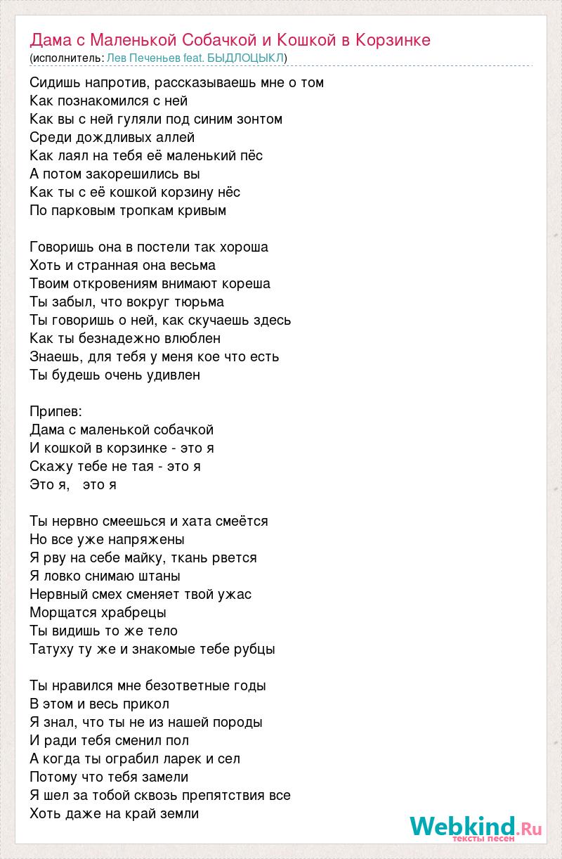 Сидишь напротив, рассказываешь мне о том Как познакомился с ней Как вы с ней гуляли под синим зонтом Среди дождливых аллей Как лаял на тебя её маленький пёс А потом закорешились вы Как ты с её кошкой корзину нёс По парковым тропкам кривым Говоришь она в постели так хороша Хоть и странная она весьма Твоим откровениям внимают кореша Ты забыл, что вокруг тюрьма Ты говоришь о ней, как скучаешь здесь Как ты безнадежно влюблен Знаешь, для тебя у меня кое что есть Ты будешь очень удивлен Припев: Дама с маленькой собачкой И кошкой в корзинке - это я Скажу тебе не тая - это я Это я, это я Ты нервно смеешься и хата смеётся Но все уже напряжены Я рву на себе майку, ткань рвется Я ловко снимаю штаны Нервный смех сменяет твой ужас Морщатся храбрецы Ты видишь то же тело Татуху ту же и знакомые тебе рубцы Ты нравился мне безответные годы В этом и весь прикол Я знал, что ты не из нашей породы И ради тебя сменил пол А когда ты ограбил ларек и сел Потому что тебя замели Я шел за тобой сквозь препятствия все Хоть даже на край земли