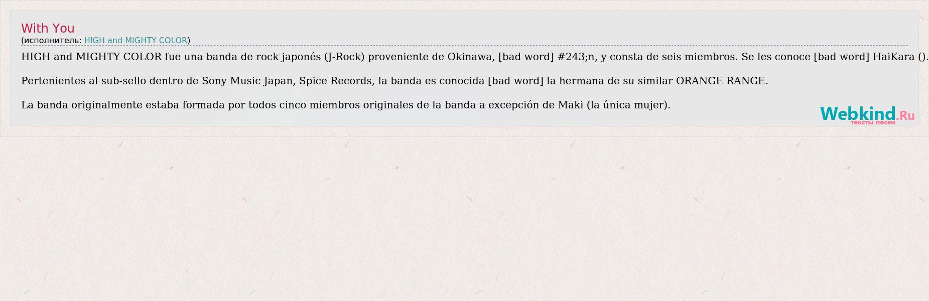 HIGH and MIGHTY COLOR fue una banda de rock japonés (J-Rock) proveniente de Okinawa, [bad word] #243;n, y consta de seis miembros. Se les conoce [bad word] HaiKara (ハイカラ). Pertenientes al sub-sello dentro de Sony Music Japan, Spice Records, la banda es conocida [bad word] la hermana de su similar ORANGE RANGE. La banda originalmente estaba formada por todos cinco miembros originales de la banda a excepción de Maki (la única mujer).