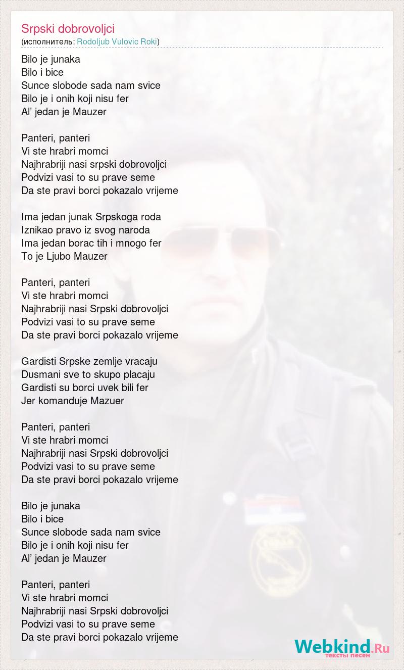 Bilo je junaka Bilo i bice Sunce slobode sada nam svice Bilo je i onih koji nisu fer Al’ jedan je Mauzer Panteri, panteri Vi ste hrabri momci Najhrabriji nasi srpski dobrovoljci Podvizi vasi to su prave seme Da ste pravi borci pokazalo vrijeme Ima jedan junak Srpskoga roda Iznikao pravo iz svog naroda Ima jedan borac tih i mnogo fer To je Ljubo Mauzer Panteri, panteri Vi ste hrabri momci Najhrabriji nasi Srpski dobrovoljci Podvizi vasi to su prave seme Da ste pravi borci pokazalo vrijeme Gardisti Srpske zemlje vracaju Dusmani sve to skupo placaju Gardisti su borci uvek bili fer Jer komanduje Mazuer Panteri, panteri Vi ste hrabri momci Najhrabriji nasi Srpski dobrovoljci Podvizi vasi to su prave seme Da ste pravi borci pokazalo vrijeme Bilo je junaka Bilo i bice Sunce slobode sada nam svice Bilo je i onih koji nisu fer Al’ jedan je Mauzer Panteri, panteri Vi ste hrabri momci Najhrabriji nasi Srpski dobrovoljci Podvizi vasi to su prave seme Da ste pravi borci pokazalo vrijeme