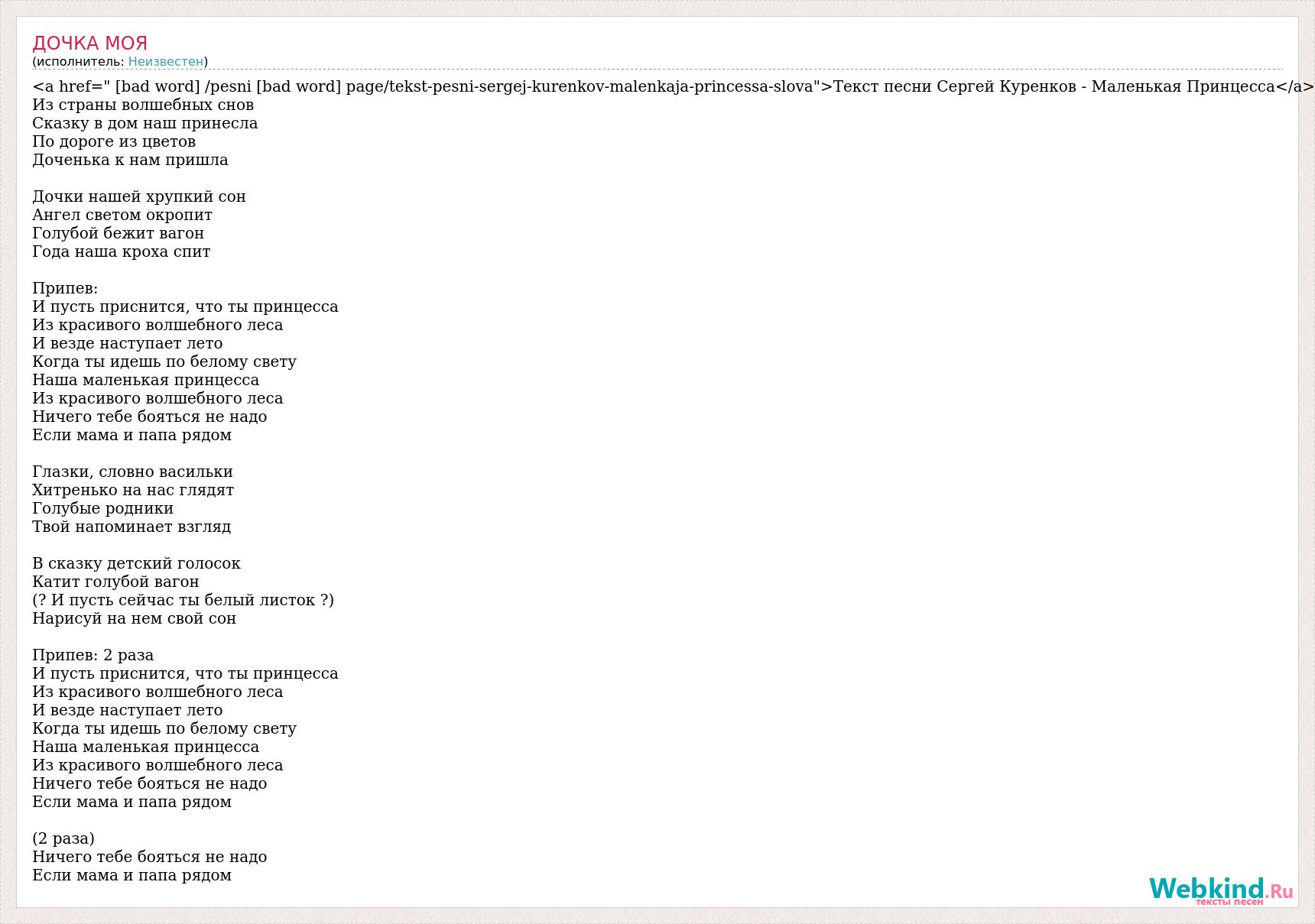 <a href=" [bad word] /pesni [bad word] page/tekst-pesni-sergej-kurenkov-malenkaja-princessa-slova">Текст песни Сергей Куренков - Маленькая Принцесса</a> Из страны волшебных снов Сказку в дом наш принесла По дороге из цветов Доченька к нам пришла Дочки нашей хрупкий сон Ангел светом окропит Голубой бежит вагон Года наша кроха спит Припев: И пусть приснится, что ты принцесса Из красивого волшебного леса И везде наступает лето Когда ты идешь по белому свету Наша маленькая принцесса Из красивого волшебного леса Ничего тебе бояться не надо Если мама и папа рядом Глазки, словно васильки Хитренько на нас глядят Голубые родники Твой напоминает взгляд В сказку детский голосок Катит голубой вагон (? И пусть сейчас ты белый листок ?) Нарисуй на нем свой сон Припев: 2 раза И пусть приснится, что ты принцесса Из красивого волшебного леса И везде наступает лето Когда ты идешь по белому свету Наша маленькая принцесса Из красивого волшебного леса Ничего тебе бояться не надо Если мама и папа рядом (2 раза) Ничего тебе бояться не надо Если мама и папа рядом