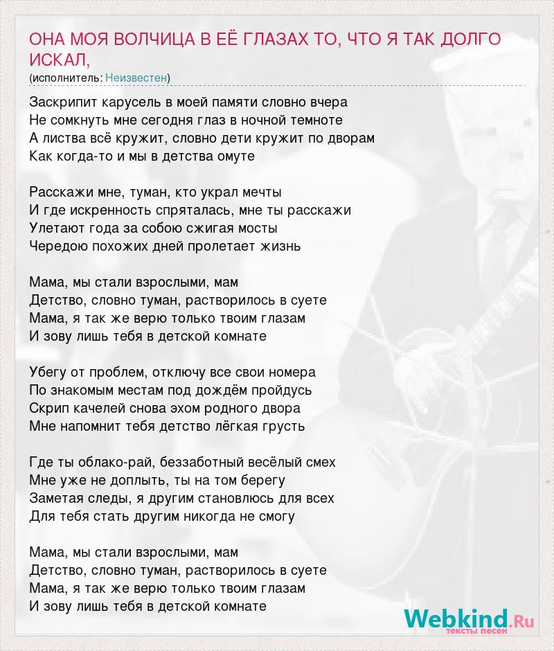 Заскрипит карусель в моей памяти словно вчера Не сомкнуть мне сегодня глаз в ночной темноте А листва всё кружит, словно дети кружит по дворам Как когда-то и мы в детства омуте Расскажи мне, туман, кто украл мечты И где искренность спряталась, мне ты расскажи Улетают года за собою сжигая мосты Чередою похожих дней пролетает жизнь Мама, мы стали взрослыми, мам Детство, словно туман, растворилось в суете Мама, я так же верю только твоим глазам И зову лишь тебя в детской комнате Убегу от проблем, отключу все свои номера По знакомым местам под дождём пройдусь Скрип качелей снова эхом родного двора Мне напомнит тебя детство лёгкая грусть Где ты облако-рай, беззаботный весёлый смех Мне уже не доплыть, ты на том берегу Заметая следы, я другим становлюсь для всех Для тебя стать другим никогда не смогу Мама, мы стали взрослыми, мам Детство, словно туман, растворилось в суете Мама, я так же верю только твоим глазам И зову лишь тебя в детской комнате