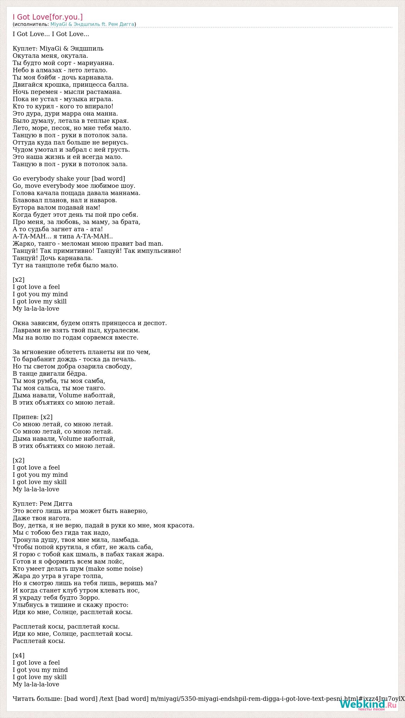 I Got Love... I Got Love... Куплет: MiyaGi & Эндшпиль Окутала меня, окутала. Ты будто мой сорт - мариуанна. Небо в алмазах - лето летало. Ты моя бэйби - дочь карнавала. Двигайся крошка, принцесса балла. Ночь перемен - мысли растамана. Пока не устал - музыка играла. Кто то курил - кого то впирало! Это дура, дури марра она манна. Было думалу, летала в теплые края. Лето, море, песок, но мне тебя мало. Танцую в пол - руки в потолок зала. Оттуда куда пал больше не вернусь. Чудом умотал и забрал с ней грусть. Это наша жизнь и ей всегда мало. Танцую в пол - руки в потолок зала. Go everybody shake your [bad word] Go, move everybody мое любимое шоу. Голова качала пощада давала маннама. Блавовал планов, нал и наваров. Бутора валом подавай нам! Когда будет этот день ты пой про себя. Про меня, за любовь, за маму, за брата, А то судьба загнет ата - ата! А-ТА-МАН... я типа А-ТА-МАН.. Жарко, танго - меломан мною правит bad man. Танцуй! Так примитивно! Танцуй! Так импульсивно! Танцуй! Дочь карнавала. Тут на танцполе тебя было мало. [x2] I got love a feel I got you my mind I got love my skill My la-la-la-love Окна зависим, будем опять принцесса и деспот. Лаврами не взять твой пыл, куралесим. Мы на волю по годам сорвемся вместе. За мгновение облететь планеты ни по чем, То барабанит дождь - тоска да печаль. Но ты светом добра озарила свободу, В танце двигали бёдра. Ты моя румба, ты моя самба, Ты моя сальса, ты мое танго. Дыма навали, Volume наболтай, В этих объятиях со мною летай. Припев: [х2] Со мною летай, со мною летай. Со мною летай, со мною летай. Дыма навали, Volume наболтай, В этих объятиях со мною летай. [х2] I got love a feel I got you my mind I got love my skill My la-la-la-love Куплет: Рем Дигга Это всего лишь игра может быть наверно, Даже твоя нагота. Воу, детка, я не верю, падай в руки ко мне, моя красота. Мы с тобою без гида так надо, Тронула душу, твоя мне мила, ламбада. Чтобы попой крутила, я сбит, не жаль саба, Я горю с тобой как шмаль, в пабах такая жара. Готов и я оформить всем вам лойс, Кто умеет делать шум (make some noise) Жара до утра в угаре толпа, Но я смотрю лишь на тебя лишь, веришь ма? И когда станет клуб утром клевать нос, Я украду тебя будто Зорро. Улыбнусь в тишине и скажу просто: Иди ко мне, Солнце, расплетай косы. Расплетай косы, расплетай косы. Иди ко мне, Солнце, расплетай косы. Расплетай косы. [x4] I got love a feel I got you my mind I got love my skill My la-la-la-love Читать больше: [bad word] /text [bad word] m/miyagi/5350-miyagi-endshpil-rem-digga-i-got-love-text-pesni.html#ixzz4Jru7oylX