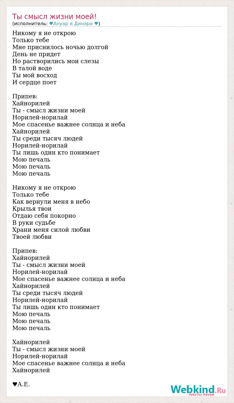 Никому я не открою Только тебе Мне приснилось ночью долгой День не придет Но растворились мои слезы В талой воде Ты мой восход И сердце поет Припев: Хайнорилей Ты - смысл жизни моей Норилей-норилай Мое спасенье важнее солнца и неба Хайнорилей Ты среди тысяч людей Норилей-норилай Ты лишь один кто понимает Мою печаль Мою печаль Мою печаль Никому я не открою Только тебе Как вернули меня в небо Крылья твои Отдаю себя покорно В руки судьбе Храни меня силой любви Твоей любви Припев: Хайнорилей Ты - смысл жизни моей Норилей-норилай Мое спасенье важнее солнца и неба Хайнорилей Ты среди тысяч людей Норилей-норилай Ты лишь один кто понимает Мою печаль Мою печаль Мою печаль Хайнорилей Ты - смысл жизни моей Норилей-норилай Мое спасенье важнее солнца и неба Хайнорилей ♥А.Е.