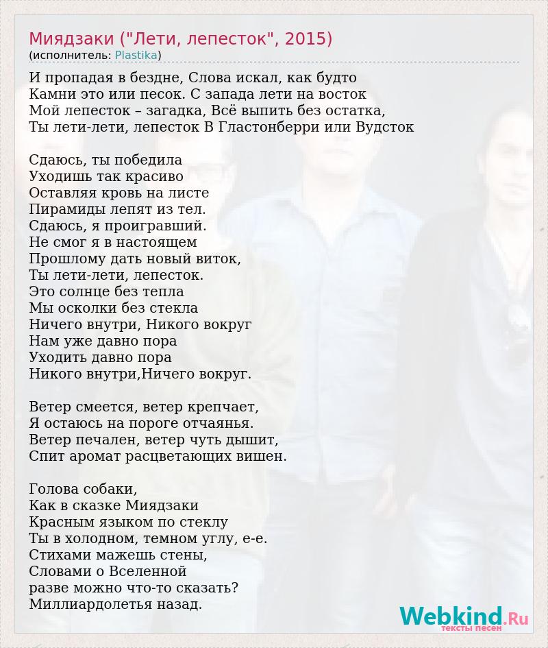 И пропадая в бездне, Слова искал, как будто Камни это или песок. С запада лети на восток Мой лепесток – загадка, Всё выпить без остатка, Ты лети-лети, лепесток В Гластонберри или Вудсток Сдаюсь, ты победила Уходишь так красиво Оставляя кровь на листе Пирамиды лепят из тел. Сдаюсь, я проигравший. Не смог я в настоящем Прошлому дать новый виток, Ты лети-лети, лепесток. Это солнце без тепла Мы осколки без стекла Ничего внутри, Никого вокруг Нам уже давно пора Уходить давно пора Никого внутри,Ничего вокруг. Ветер смеется, ветер крепчает, Я остаюсь на пороге отчаянья. Ветер печален, ветер чуть дышит, Спит аромат расцветающих вишен. Голова собаки, Как в сказке Миядзаки Красным языком по стеклу Ты в холодном, темном углу, е-е. Стихами мажешь стены, Словами о Вселенной разве можно что-то сказать? Миллиардолетья назад.