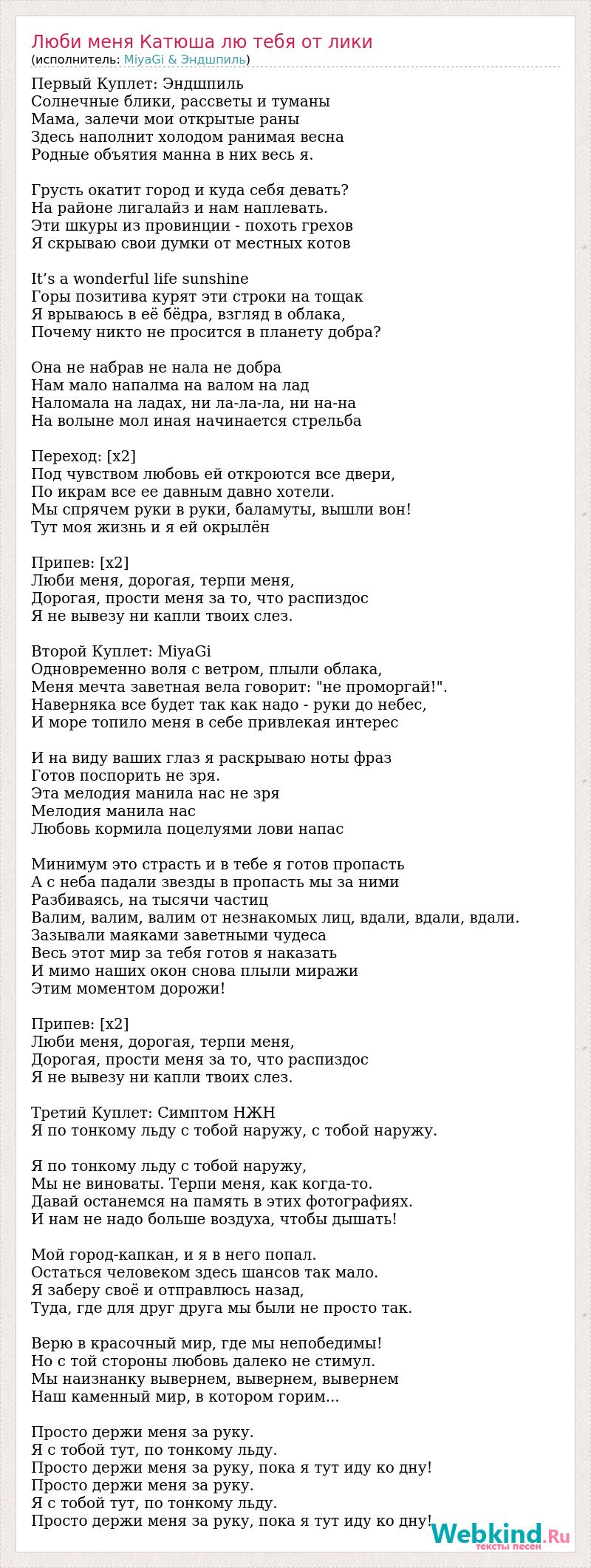 Первый Куплет: Эндшпиль Солнечные блики, рассветы и туманы Мама, залечи мои открытые раны Здесь наполнит холодом ранимая весна Родные объятия манна в них весь я. Грусть окатит город и куда себя девать? На районе лигалайз и нам наплевать. Эти шкуры из провинции - похоть грехов Я скрываю свои думки от местных котов It’s a wonderful life sunshine Горы позитива курят эти строки на тощак Я врываюсь в её бёдра, взгляд в облака, Почему никто не просится в планету добра? Она не набрав не нала не добра Нам мало напалма на валом на лад Наломала на ладах, ни ла-ла-ла, ни на-на На волыне мол иная начинается стрельба Переход: [х2] Под чувством любовь ей откроются все двери, По икрам все ее давным давно хотели. Мы спрячем руки в руки, баламуты, вышли вон! Тут моя жизнь и я ей окрылён Припев: [х2] Люби меня, дорогая, терпи меня, Дорогая, прости меня за то, что распиздос Я не вывезу ни капли твоих слез. Второй Куплет: MiyaGi Одновременно воля с ветром, плыли облака, Меня мечта заветная вела говорит: "не проморгай!". Наверняка все будет так как надо - руки до небес, И море топило меня в себе привлекая интерес И на виду ваших глаз я раскрываю ноты фраз Готов поспорить не зря. Эта мелодия манила нас не зря Мелодия манила нас Любовь кормила поцелуями лови напас Минимум это страсть и в тебе я готов пропасть А с неба падали звезды в пропасть мы за ними Разбиваясь, на тысячи частиц Валим, валим, валим от незнакомых лиц, вдали, вдали, вдали. Зазывали маяками заветными чудеса Весь этот мир за тебя готов я наказать И мимо наших окон снова плыли миражи Этим моментом дорожи! Припев: [х2] Люби меня, дорогая, терпи меня, Дорогая, прости меня за то, что распиздос Я не вывезу ни капли твоих слез. Третий Куплет: Симптом НЖН Я по тонкому льду с тобой наружу, с тобой наружу. Я по тонкому льду с тобой наружу, Мы не виноваты. Терпи меня, как когда-то. Давай останемся на память в этих фотографиях. И нам не надо больше воздуха, чтобы дышать! Мой город-капкан, и я в него попал. Остаться человеком здесь шансов так мало. Я заберу своё и отправлюсь назад, Туда, где для друг друга мы были не просто так. Верю в красочный мир, где мы непобедимы! Но с той стороны любовь далеко не стимул. Мы наизнанку вывернем, вывернем, вывернем Наш каменный мир, в котором горим... Просто держи меня за руку. Я с тобой тут, по тонкому льду. Просто держи меня за руку, пока я тут иду ко дну! Просто держи меня за руку. Я с тобой тут, по тонкому льду. Просто держи меня за руку, пока я тут иду ко дну!
