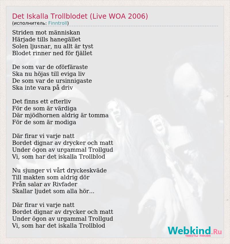 Striden mot människan Härjade tills hanegället Solen ljusnar, nu allt är tyst Blodet rinner ned för fjället De som var de oförfäraste Ska nu höjas till eviga liv De som var de ursinnigaste Ska inte vara på driv Det finns ett efterliv För de som är värdiga Där mjödhornen aldrig är tomma För de som är modiga Där firar vi varje natt Bordet dignar av drycker och matt Under ögon av urgammal Trollgud Vi, som har det iskalla Trollblod Nu sjunger vi vårt dryckeskväde Till makten som aldrig dör Från salar av Rivfader Skallar ljudet som alla hör... Där firar vi varje natt Bordet dignar av drycker och matt Under ögon av urgammal Trollgud Vi, som har det iskalla Trollblod