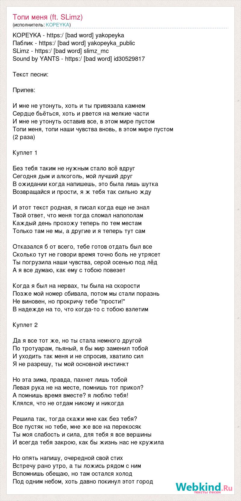 KOPEYKA - https:/ [bad word] yakopeyka Паблик - https:/ [bad word] yakopeyka_public SLimz - https:/ [bad word] slimz_mc Sound by YANTS - https:/ [bad word] id30529817 Текст песни: Припев: И мне не утонуть, хоть и ты привязала камнем Сердце бьёться, хоть и рвется на мелкие части И мне не утонуть оставив все, в этом мире пустом Топи меня, топи наши чувства вновь, в этом мире пустом (2 раза) Куплет 1 Без тебя таким не нужным стало всё вдруг Сегодня дым и алкоголь, мой лучший друг В ожидании когда напишешь, это была лишь шутка Возвращайся и прости, я ж тебя так сильно жду И этот текст родная, я писал когда еще не знал Твой ответ, что меня тогда сломал напополам Каждый день прохожу теперь по тем местам Только там не мы, а другие и я теперь тут сам Отказался б от всего, тебе готов отдать был все Сколько тут не говори время точно боль не утрясет Ты погрузила наши чувства, серой осенью под лёд А я все думаю, как ему с тобою повезет Когда я был на нервах, ты была на скорости Позже мой номер сбивала, потом мы стали поразнь Не виновен, но прокричу тебе "прости!" В надежде на то, что когда-то с тобою взлетим Куплет 2 Да я все тот же, но ты стала немного другой По тротуарам, пьяный, я бы мир заменил тобой И уходить так меня и не спросив, хватило сил Я не разрешу, ты мой основной инстинкт Но эта зима, правда, пахнет лишь тобой Левая рука не на месте, помнишь тот прикол? А помнишь время вместе? я люблю тебя! Клялся, что не отдам никому и никогда Решила так, тогда скажи мне как без тебя? Все пустяк но тебе, мне же все на перекосяк Ты моя слабость и сила, для тебя я все вершины И всегда тебя закрою, как бы жизнь нас не кружила Но опять напишу, очередной свой стих Встречу рано утро, а ты ложись рядом с ним Вспомнишь обещаю, но там остался холод Под одним небом, хоть давно покинул этот город