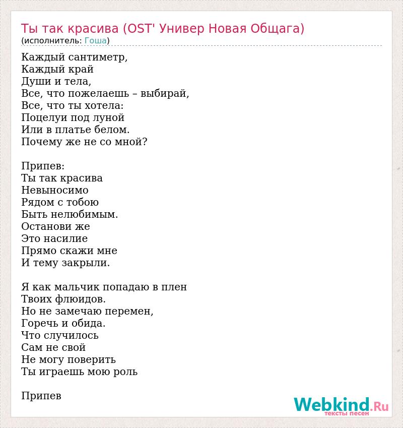 Каждый сантиметр, Каждый край Души и тела, Все, что пожелаешь – выбирай, Все, что ты хотела: Поцелуи под луной Или в платье белом. Почему же не со мной? Припев: Ты так красива Невыносимо Рядом с тобою Быть нелюбимым. Останови же Это насилие Прямо скажи мне И тему закрыли. Я как мальчик попадаю в плен Твоих флюидов. Но не замечаю перемен, Горечь и обида. Что случилось Сам не свой Не могу поверить Ты играешь мою роль Припев