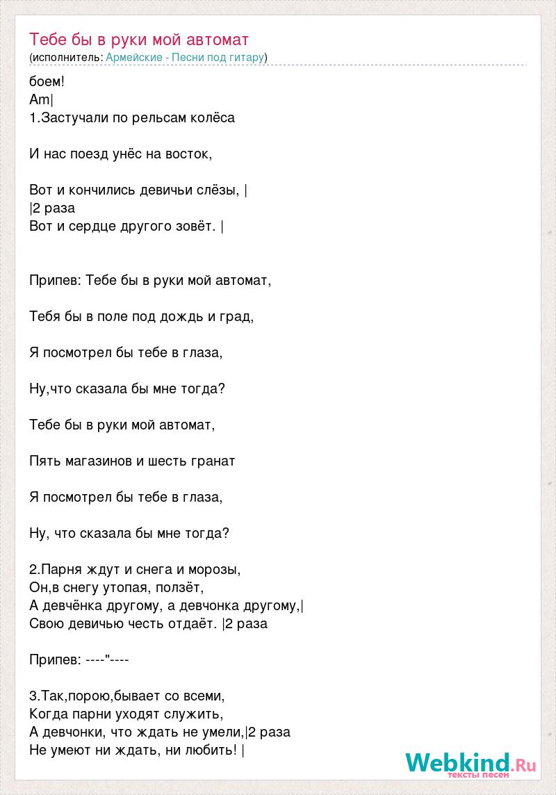боем! Am| 1.Застучали по рельсам колёса И нас поезд унёс на восток, Вот и кончились девичьи слёзы, | |2 раза Вот и сердце другого зовёт. | Припев: Тебе бы в руки мой автомат, Тебя бы в поле под дождь и град, Я посмотрел бы тебе в глаза, Ну,что сказала бы мне тогда? Тебе бы в руки мой автомат, Пять магазинов и шесть гранат Я посмотрел бы тебе в глаза, Ну, что сказала бы мне тогда? 2.Парня ждут и снега и морозы, Он,в снегу утопая, ползёт, А девчёнка другому, а девчонка другому,| Свою девичью честь отдаёт. |2 раза Припев: ----"---- 3.Так,порою,бывает со всеми, Когда парни уходят служить, А девчонки, что ждать не умели,|2 раза Не умеют ни ждать, ни любить! |