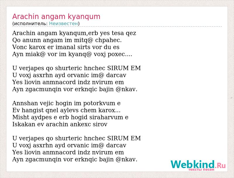 Arachin angam kyanqum,erb yes tesa qez Qo anunn angam im mitq@ chpahec. Vonc karox er imanal sirts vor du es Ayn miak@ vor im kyanq@ voxj poxec.... U verjapes qo shurteric hnchec SIRUM EM U voxj asxrhn ayd orvanic im@ darcav Yes liovin anmnacord indz nvirum em Ayn zgacmunqin vor erknqic bajin @nkav. Annshan vejic hogin im potorkvum e Ev hangist qnel aylevs chem karox... Misht aydpes e erb hogid siraharvum e Iskakan ev arachin ankexc sirov U verjapes qo shurteric hnchec SIRUM EM U voxj asxrhn ayd orvanic im@ darcav Yes liovin anmnacord indz nvirum em Ayn zgacmunqin vor erknqic bajin @nkav.