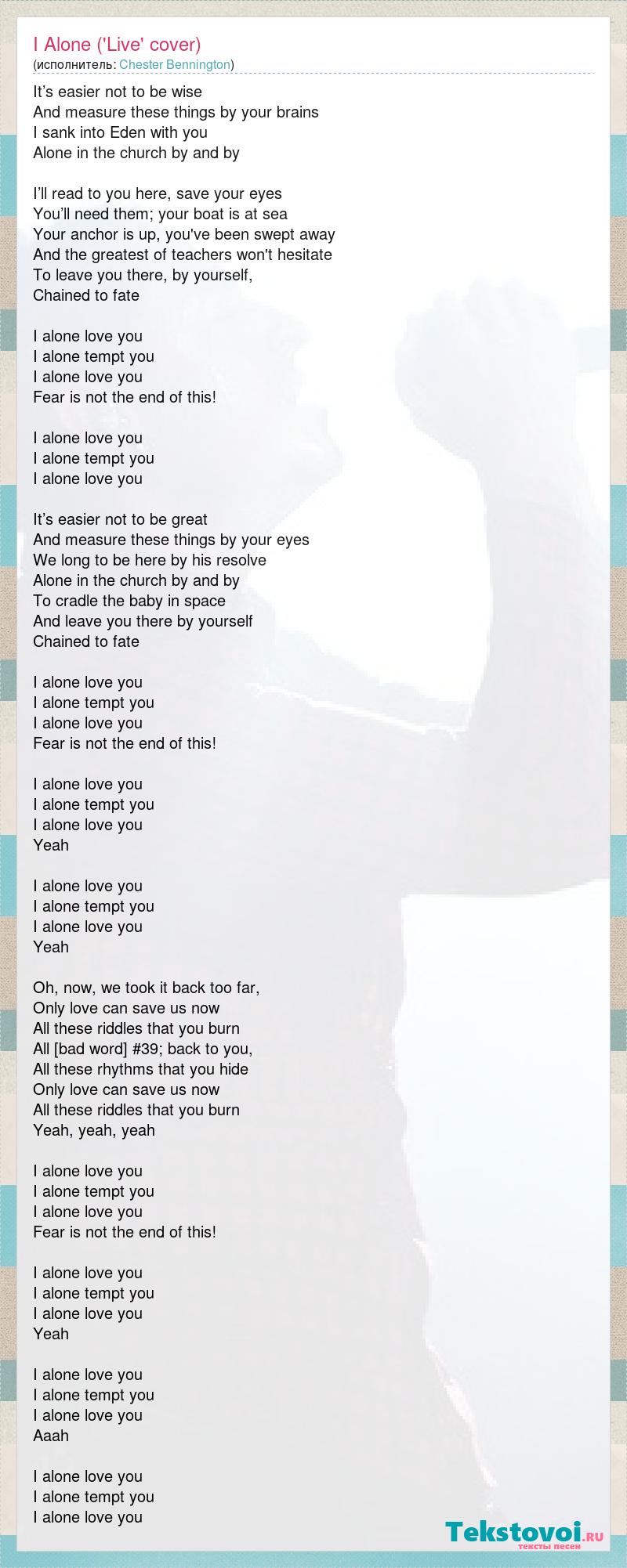 It’s easier not to be wise And measure these things by your brains I sank into Eden with you Alone in the church by and by I’ll read to you here, save your eyes You’ll need them; your boat is at sea Your anchor is up, you've been swept away And the greatest of teachers won't hesitate To leave you there, by yourself, Chained to fate I alone love you I alone tempt you I alone love you Fear is not the end of this! I alone love you I alone tempt you I alone love you It’s easier not to be great And measure these things by your eyes We long to be here by his resolve Alone in the church by and by To cradle the baby in space And leave you there by yourself Chained to fate I alone love you I alone tempt you I alone love you Fear is not the end of this! I alone love you I alone tempt you I alone love you Yeah I alone love you I alone tempt you I alone love you Yeah Oh, now, we took it back too far, Only love can save us now All these riddles that you burn All [bad word] #39; back to you, All these rhythms that you hide Only love can save us now All these riddles that you burn Yeah, yeah, yeah I alone love you I alone tempt you I alone love you Fear is not the end of this! I alone love you I alone tempt you I alone love you Yeah I alone love you I alone tempt you I alone love you Aaah I alone love you I alone tempt you I alone love you