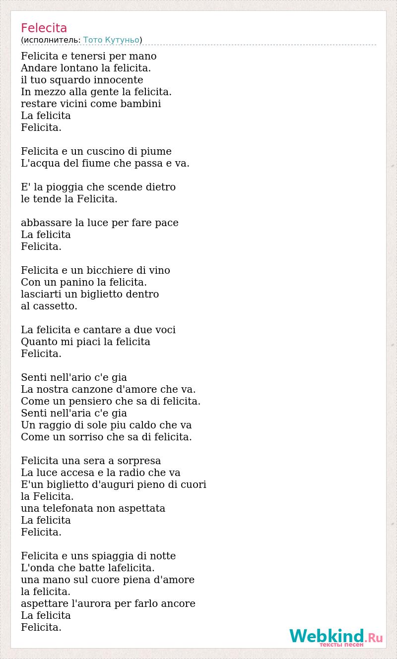 Felicita e tenersi per mano Andare lontano la felicita. il tuo squardo innocente In mezzo alla gente la felicita. restare vicini come bambini La felicita Felicita. Felicita e un cuscino di piume L'acqua del fiume che passa e va. E' la pioggia che scende dietro le tende la Felicita. abbassare la luce per fare pace La felicita Felicita. Felicita e un bicchiere di vino Con un panino la felicita. lasciarti un biglietto dentro al cassetto. La felicita e cantare a due voci Quanto mi piaci la felicita Felicita. Senti nell'ario c'e gia La nostra canzone d'amore che va. Come un pensiero che sa di felicita. Senti nell'aria c'e gia Un raggio di sole piu caldo che va Come un sorriso che sa di felicita. Felicita una sera a sorpresa La luce accesa e la radio che va E'un biglietto d'auguri pieno di cuori la Felicita. una telefonata non aspettata La felicita Felicita. Felicita e uns spiaggia di notte L'onda che batte lafelicita. una mano sul cuore piena d'amore la felicita. aspettare l'aurora per farlo ancore La felicita Felicita.