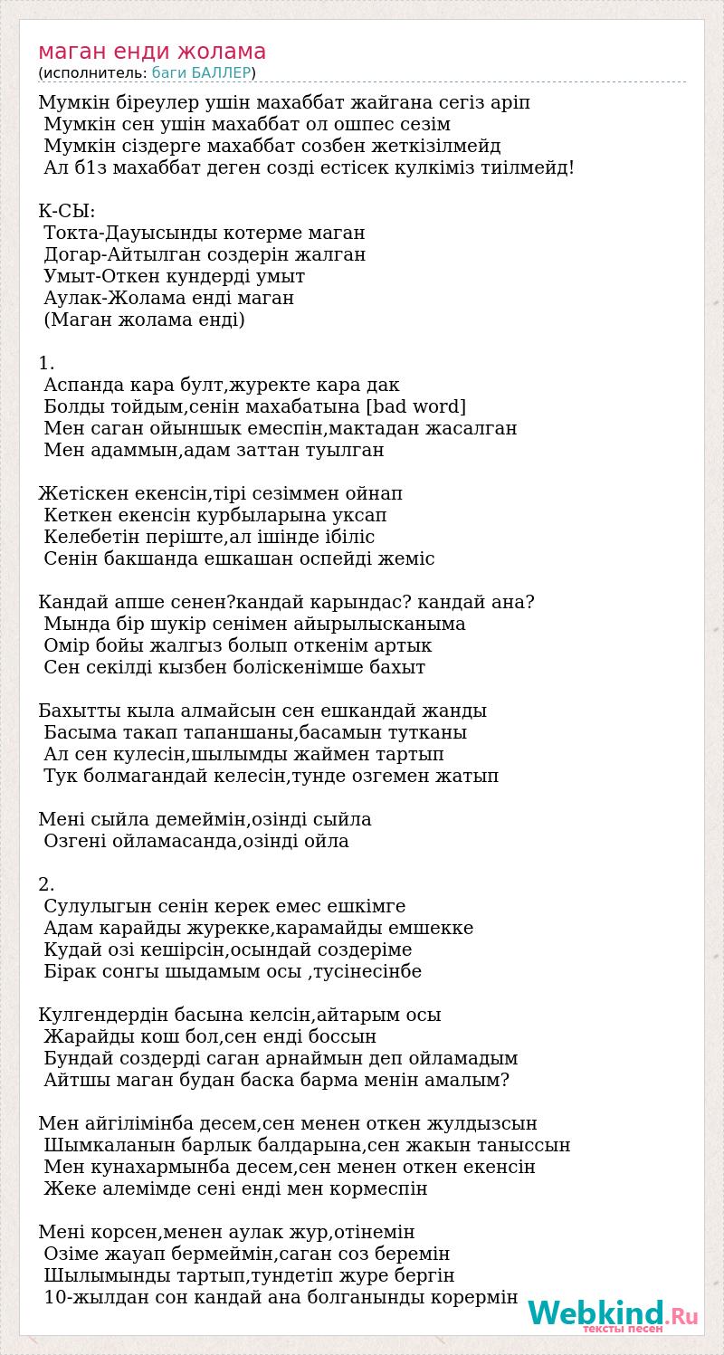 Мумкiн бiреулер ушiн махаббат жайгана сегiз арiп Мумкiн сен ушiн махаббат ол ошпес сезiм Мумкiн сiздерге махаббат созбен жеткiзiлмейд Ал б1з махаббат деген создi естiсек кулкiмiз тиiлмейд! К-СЫ: Токта-Дауысынды котерме маган Догар-Айтылган создерiн жалган Умыт-Откен кундердi умыт Аулак-Жолама ендi маган (Маган жолама ендi) 1. Аспанда кара булт,журекте кара дак Болды тойдым,сенiн махабатына [bad word] Мен саган ойыншык емеспiн,мактадан жасалган Мен адаммын,адам заттан туылган Жетiскен екенсiн,тiрi сезiммен ойнап Кеткен екенсiн курбыларына уксап Келебетiн перiште,ал iшiнде iбiлiс Сенiн бакшанда ешкашан оспейдi жемiс Кандай апше сенен?кандай карындас? кандай ана? Мында бiр шукiр сенiмен айырылысканыма Омiр бойы жалгыз болып откенiм артык Сен секiлдi кызбен болiскенiмше бахыт Бахытты кыла алмайсын сен ешкандай жанды Басыма такап тапаншаны,басамын тутканы Ал сен кулесiн,шылымды жаймен тартып Тук болмагандай келесiн,тунде озгемен жатып Менi сыйла демеймiн,озiндi сыйла Озгенi ойламасанда,озiндi ойла 2. Сулулыгын сенiн керек емес ешкiмге Адам карайды журекке,карамайды емшекке Кудай озi кешiрсiн,осындай создерiме Бiрак сонгы шыдамым осы ,тусiнесiнбе Кулгендердiн басына келсiн,айтарым осы Жарайды кош бол,сен ендi боссын Бундай создердi саган арнаймын деп ойламадым Айтшы маган будан баска барма менiн амалым? Мен айгiлiмiнба десем,сен менен откен жулдызсын Шымкаланын барлык балдарына,сен жакын таныссын Мен кунахармынба десем,сен менен откен екенсiн Жеке алемiмде сенi ендi мен кормеспiн Менi корсен,менен аулак жур,отiнемiн Озiме жауап бермеймiн,саган соз беремiн Шылымынды тартып,тундетiп журе бергiн 10-жылдан сон кандай ана болганынды корермiн