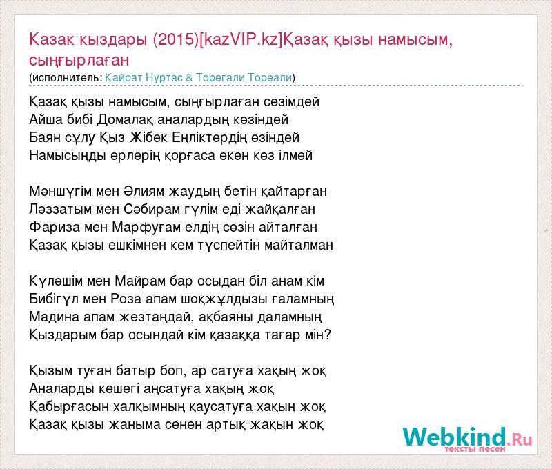 Қазақ қызы намысым, сыңғырлаған сезімдей Айша бибі Домалақ аналардың көзіндей Баян сұлу Қыз Жібек Еңліктердің өзіндей Намысыңды ерлерің қорғаса екен көз ілмей Мәншүгім мен Әлиям жаудың бетін қайтарған Ләззатым мен Сәбирам гүлім еді жайқалған Фариза мен Марфуғам елдің сөзін айталған Қазақ қызы ешкімнен кем түспейтін майталман Күләшім мен Майрам бар осыдан бiл анам кiм Бибігүл мен Роза апам шоқжұлдызы ғаламның Мадина апам жезтаңдай, ақбаяны даламның Қыздарым бар осындай кім қазаққа тағар мін? Қызым туған батыр боп, ар сатуға хақың жоқ Аналарды кешегі аңсатуға хақың жоқ Қабырғасын халқымның қаусатуға хақың жоқ Қазақ қызы жаныма сенен артық жақын жоқ