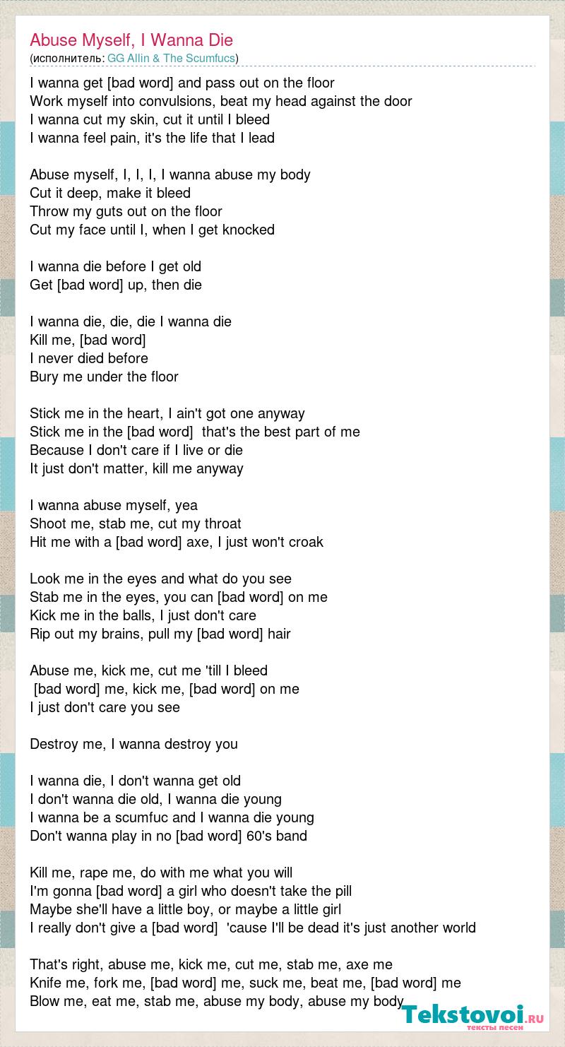 I wanna get [bad word] and pass out on the floor Work myself into convulsions, beat my head against the door I wanna cut my skin, cut it until I bleed I wanna feel pain, it's the life that I lead Abuse myself, I, I, I, I wanna abuse my body Cut it deep, make it bleed Throw my guts out on the floor Cut my face until I, when I get knocked I wanna die before I get old Get [bad word] up, then die I wanna die, die, die I wanna die Kill me, [bad word] I never died before Bury me under the floor Stick me in the heart, I ain't got one anyway Stick me in the [bad word] that's the best part of me Because I don't care if I live or die It just don't matter, kill me anyway I wanna abuse myself, yea Shoot me, stab me, cut my throat Hit me with a [bad word] axe, I just won't croak Look me in the eyes and what do you see Stab me in the eyes, you can [bad word] on me Kick me in the balls, I just don't care Rip out my brains, pull my [bad word] hair Abuse me, kick me, cut me 'till I bleed [bad word] me, kick me, [bad word] on me I just don't care you see Destroy me, I wanna destroy you I wanna die, I don't wanna get old I don't wanna die old, I wanna die young I wanna be a scumfuc and I wanna die young Don't wanna play in no [bad word] 60's band Kill me, rape me, do with me what you will I'm gonna [bad word] a girl who doesn't take the pill Maybe she'll have a little boy, or maybe a little girl I really don't give a [bad word] 'cause I'll be dead it's just another world That's right, abuse me, kick me, cut me, stab me, axe me Knife me, fork me, [bad word] me, suck me, beat me, [bad word] me Blow me, eat me, stab me, abuse my body, abuse my body