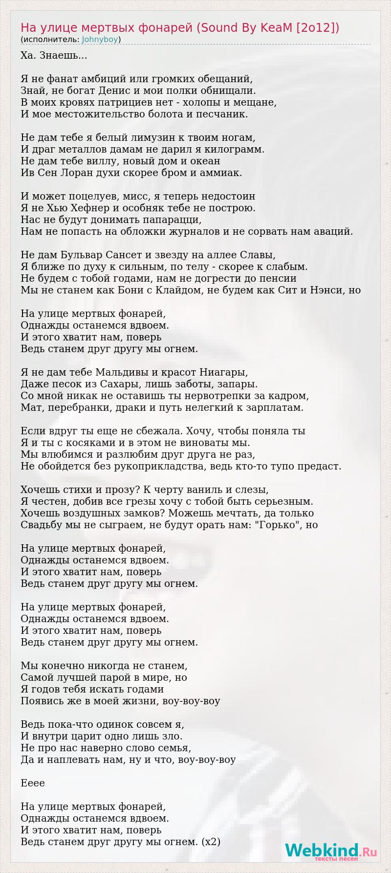 Ха. Знаешь... Я не фанат амбиций или громких обещаний, Знай, не богат Денис и мои полки обнищали. В моих кровях патрициев нет - холопы и мещане, И мое местожительство болота и песчаник. Не дам тебе я белый лимузин к твоим ногам, И драг металлов дамам не дарил я килограмм. Не дам тебе виллу, новый дом и океан Ив Сен Лоран духи скорее бром и аммиак. И может поцелуев, мисс, я теперь недостоин Я не Хью Хефнер и особняк тебе не построю. Нас не будут донимать папарацци, Нам не попасть на обложки журналов и не сорвать нам аваций. Не дам Бульвар Сансет и звезду на аллее Славы, Я ближе по духу к сильным, по телу - скорее к слабым. Не будем с тобой годами, нам не догрести до пенсии Мы не станем как Бони с Клайдом, не будем как Сит и Нэнси, но На улице мертвых фонарей, Однажды останемся вдвоем. И этого хватит нам, поверь Ведь станем друг другу мы огнем. Я не дам тебе Мальдивы и красот Ниагары, Даже песок из Сахары, лишь заботы, запары. Со мной никак не оставишь ты нервотрепки за кадром, Мат, перебранки, драки и путь нелегкий к зарплатам. Если вдруг ты еще не сбежала. Хочу, чтобы поняла ты Я и ты с косяками и в этом не виноваты мы. Мы влюбимся и разлюбим друг друга не раз, Не обойдется без рукоприкладства, ведь кто-то тупо предаст. Хочешь стихи и прозу? К черту ваниль и слезы, Я честен, добив все грезы хочу с тобой быть серьезным. Хочешь воздушных замков? Можешь мечтать, да только Свадьбу мы не сыграем, не будут орать нам: "Горько", но На улице мертвых фонарей, Однажды останемся вдвоем. И этого хватит нам, поверь Ведь станем друг другу мы огнем. На улице мертвых фонарей, Однажды останемся вдвоем. И этого хватит нам, поверь Ведь станем друг другу мы огнем. Мы конечно никогда не станем, Самой лучшей парой в мире, но Я годов тебя искать годами Появись же в моей жизни, воу-воу-воу Ведь пока-что одинок совсем я, И внутри царит одно лишь зло. Не про нас наверно слово семья, Да и наплевать нам, ну и что, воу-воу-воу Ееее На улице мертвых фонарей, Однажды останемся вдвоем. И этого хватит нам, поверь Ведь станем друг другу мы огнем. (x2)