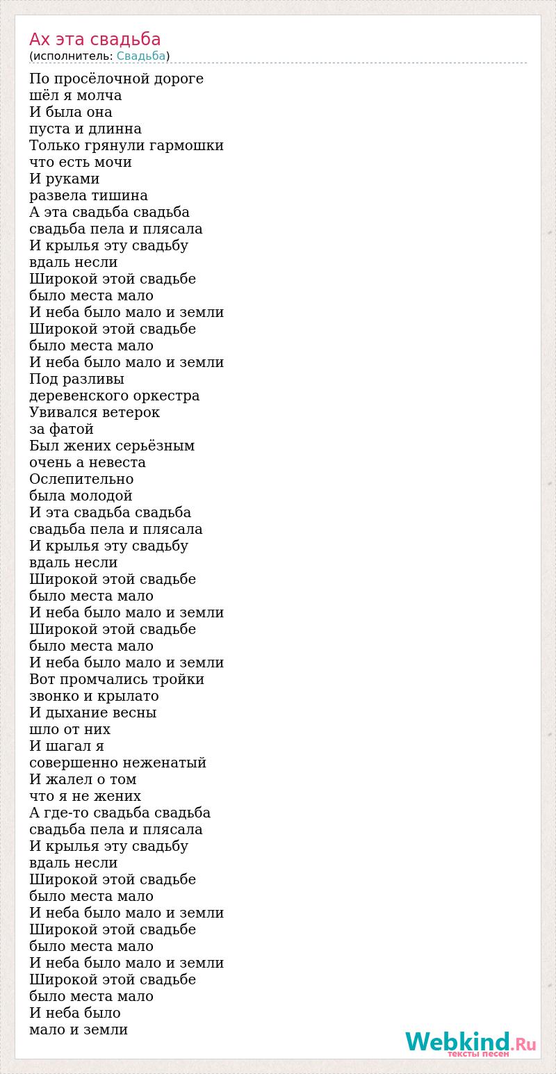 По просёлочной дороге шёл я молча И была она пуста и длинна Только грянули гармошки что есть мочи И руками развела тишина А эта свадьба свадьба свадьба пела и плясала И крылья эту свадьбу вдаль несли Широкой этой свадьбе было места мало И неба было мало и земли Широкой этой свадьбе было места мало И неба было мало и земли Под разливы деревенского оркестра Увивался ветерок за фатой Был жених серьёзным очень а невеста Ослепительно была молодой И эта свадьба свадьба свадьба пела и плясала И крылья эту свадьбу вдаль несли Широкой этой свадьбе было места мало И неба было мало и земли Широкой этой свадьбе было места мало И неба было мало и земли Вот промчались тройки звонко и крылато И дыхание весны шло от них И шагал я совершенно неженатый И жалел о том что я не жених А где-то свадьба свадьба свадьба пела и плясала И крылья эту свадьбу вдаль несли Широкой этой свадьбе было места мало И неба было мало и земли Широкой этой свадьбе было места мало И неба было мало и земли Широкой этой свадьбе было места мало И неба было мало и земли