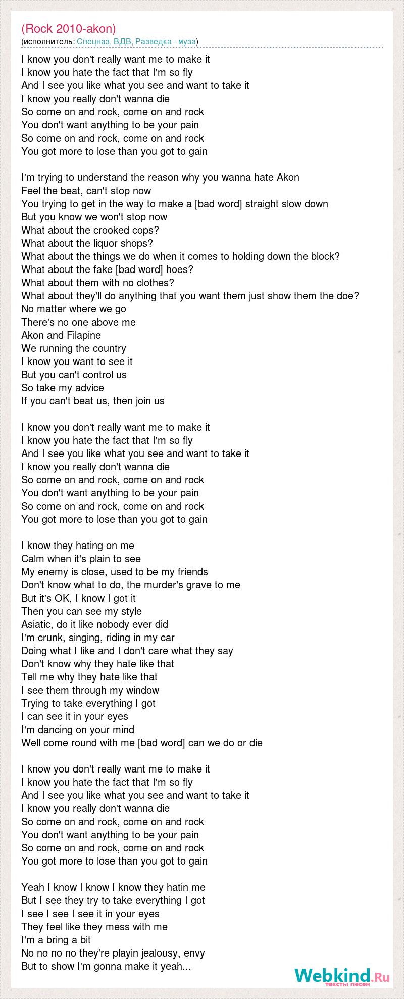 I know you don't really want me to make it I know you hate the fact that I'm so fly And I see you like what you see and want to take it I know you really don't wanna die So come on and rock, come on and rock You don't want anything to be your pain So come on and rock, come on and rock You got more to lose than you got to gain I'm trying to understand the reason why you wanna hate Akon Feel the beat, can't stop now You trying to get in the way to make a [bad word] straight slow down But you know we won't stop now What about the crooked cops? What about the liquor shops? What about the things we do when it comes to holding down the block? What about the fake [bad word] hoes? What about them with no clothes? What about they'll do anything that you want them just show them the doe? No matter where we go There's no one above me Akon and Filapine We running the country I know you want to see it But you can't control us So take my advice If you can't beat us, then join us I know you don't really want me to make it I know you hate the fact that I'm so fly And I see you like what you see and want to take it I know you really don't wanna die So come on and rock, come on and rock You don't want anything to be your pain So come on and rock, come on and rock You got more to lose than you got to gain I know they hating on me Calm when it's plain to see My enemy is close, used to be my friends Don't know what to do, the murder's grave to me But it's OK, I know I got it Then you can see my style Asiatic, do it like nobody ever did I'm crunk, singing, riding in my car Doing what I like and I don't care what they say Don't know why they hate like that Tell me why they hate like that I see them through my window Trying to take everything I got I can see it in your eyes I'm dancing on your mind Well come round with me [bad word] can we do or die I know you don't really want me to make it I know you hate the fact that I'm so fly And I see you like what you see and want to take it I know you really don't wanna die So come on and rock, come on and rock You don't want anything to be your pain So come on and rock, come on and rock You got more to lose than you got to gain Yeah I know I know I know they hatin me But I see they try to take everything I got I see I see I see it in your eyes They feel like they mess with me I'm a bring a bit No no no no they're playin jealousy, envy But to show I'm gonna make it yeah...