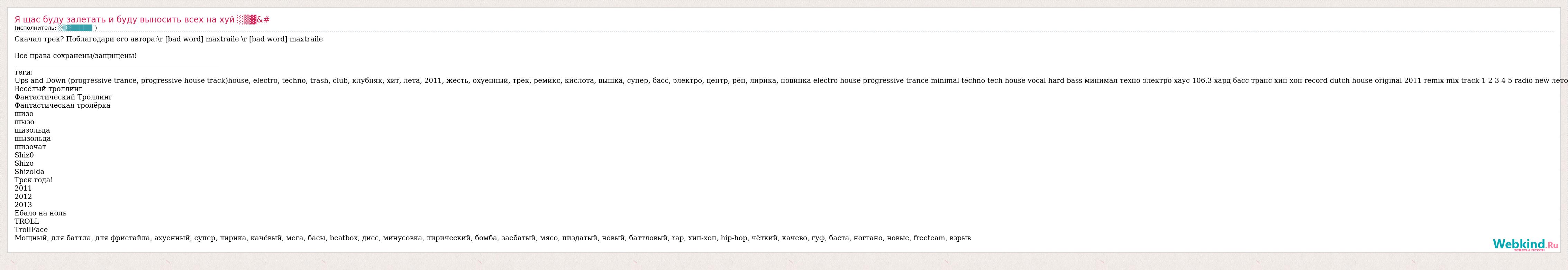 Скачал трек? Поблагодари его автора:\r [bad word] maxtraile \r [bad word] maxtraile Все права сохранены/защищены! ___________________________________________________________ теги: Ups and Down (progressive trance, progressive house track)house, electro, techno, trash, club, клубняк, хит, лета, 2011, жесть, охуенный, трек, ремикс, кислота, вышка, супер, басс, электро, центр, реп, лирика, новинка electro house progressive trance minimal techno tech house vocal hard bass минимал техно электро хаус 106.3 хард басс транс хип хоп record dutch house original 2011 remix mix track 1 2 3 4 5 radio new лето Весёлый троллинг Фантастический Троллинг Фантастическая тролёрка шизо шызо шизольда шызольда шизочат Shiz0 Shizo Shizolda Трек года! 2011 2012 2013 Ебало на ноль TROLL TrollFace Мощный, для баттла, для фристайла, ахуенный, супер, лирика, качёвый, мега, басы, beatbox, дисс, минусовка, лирический, бомба, заебатый, мясо, пиздатый, новый, баттловый, rap, хип-хоп, hip-hop, чёткий, качево, гуф, баста, ноггано, новые, freeteam, взрыв