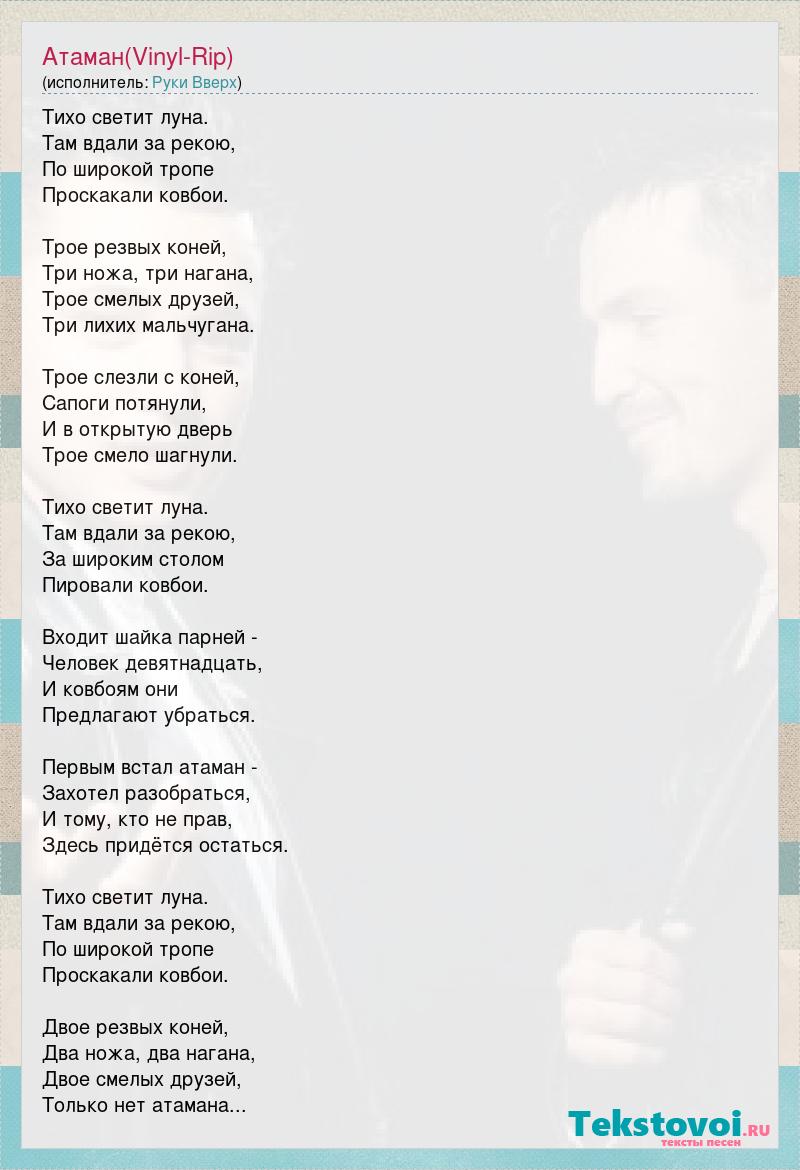 Тихо светит луна. Там вдали за рекою, По широкой тропе Проскакали ковбои. Трое резвых коней, Три ножа, три нагана, Трое смелых друзей, Три лихих мальчугана. Трое слезли с коней, Сапоги потянули, И в открытую дверь Трое смело шагнули. Тихо светит луна. Там вдали за рекою, За широким столом Пировали ковбои. Входит шайка парней - Человек девятнадцать, И ковбоям они Предлагают убраться. Первым встал атаман - Захотел разобраться, И тому, кто не прав, Здесь придётся остаться. Тихо светит луна. Там вдали за рекою, По широкой тропе Проскакали ковбои. Двое резвых коней, Два ножа, два нагана, Двое смелых друзей, Только нет атамана...
