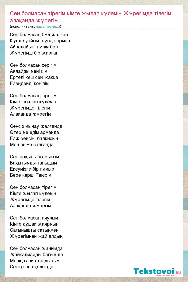 Сен болмасаң бұл жалған Күнде уайым, күнде арман Айналайын, гүлім бол Жүрегімді бір жарған Сен болмасаң серігім Аялайды мені кім Ертелі кеш сен жаққа Елеңдейді көңілім Сен болмасаң тірегім Кімге жылап күлемін Жүрегімде тілегім Алақанда жүрегім Сенсіз мынау жалғанда Өтер ме едім арманда Елжірейсің, балқисың Мен әніме салғанда Сен арқылы жарығым Бақытымды таныдым Екеумізге бір ғұмыр Бере көрші Таңірім Сен болмасаң тірегім Кімге жылап күлемін Жүрегімде тілегім Алақанда жүрегім Сен болмасаң аяулым Кімге құшақ жаярмын Сағынышты сазыңмен Жүрегімнен жай алдың Сен болмасаң жанымда Жайқалмайды бағым да Менің ғазиз тағдырым Сенің ғана қолыңда