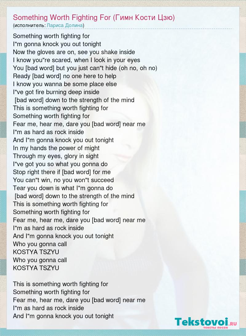 Something worth fighting for I"m gonna knock you out tonight Now the gloves are on, see you shake inside I know you"re scared, when I look in your eyes You can run but you just can"t hide (oh no, oh no) Ready to rumble no one here to help I know you wanna be some place else I"ve got fire burning deep inside It comes down to the strength of the mind This is something worth fighting for Something worth fighting for Fear me, hear me, dare you to come near me I"m as hard as rock inside And I"m gonna knock you out tonight In my hands the power of might Through my eyes, glory in sight I"ve got you so what you gonna do Stop right there if you come for me You can"t win, no you won"t succeed Tear you down is what I"m gonna do It comes down to the strength of the mind This is something worth fighting for Something worth fighting for Fear me, hear me, dare you to come near me I"m as hard as rock inside And I"m gonna knock you out tonight Who you gonna call KOSTYA TSZYU Who you gonna call KOSTYA TSZYU This is something worth fighting for Something worth fighting for Fear me, hear me, dare you to come near me I"m as hard as rock inside And I"m gonna knock you out tonight