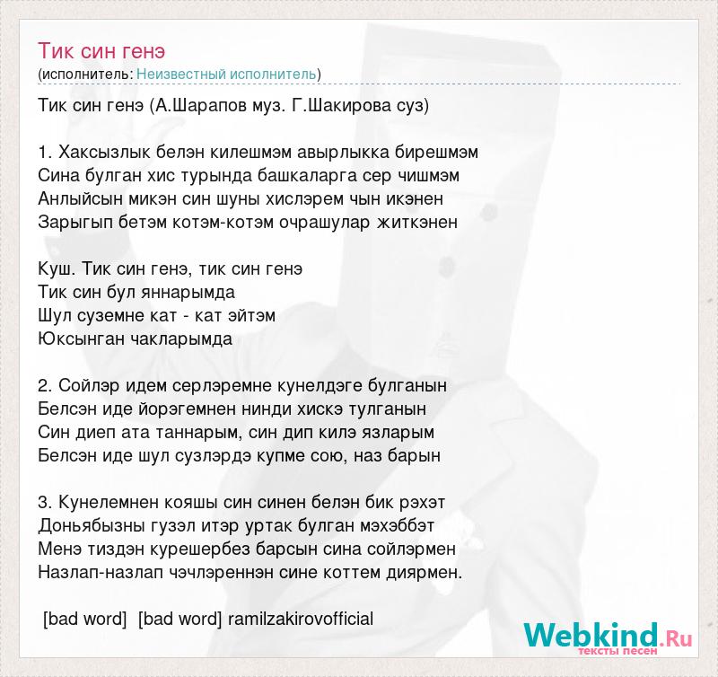 Тик син генэ (А.Шарапов муз. Г.Шакирова суз) 1. Хаксызлык белэн килешмэм авырлыкка бирешмэм Сина булган хис турында башкаларга сер чишмэм Анлыйсын микэн син шуны хислэрем чын икэнен Зарыгып бетэм котэм-котэм очрашулар житкэнен Куш. Тик син генэ, тик син генэ Тик син бул яннарымда Шул суземне кат - кат эйтэм Юксынган чакларымда 2. Сойлэр идем серлэремне кунелдэге булганын Белсэн иде йорэгемнен нинди хискэ тулганын Син диеп ата таннарым, син дип килэ язларым Белсэн иде шул сузлэрдэ купме сою, наз барын 3. Кунелемнен кояшы син синен белэн бик рэхэт Доньябызны гузэл итэр уртак булган мэхэббэт Менэ тиздэн курешербез барсын сина сойлэрмен Назлап-назлап чэчлэреннэн сине коттем диярмен. [bad word] [bad word] ramilzakirovofficial