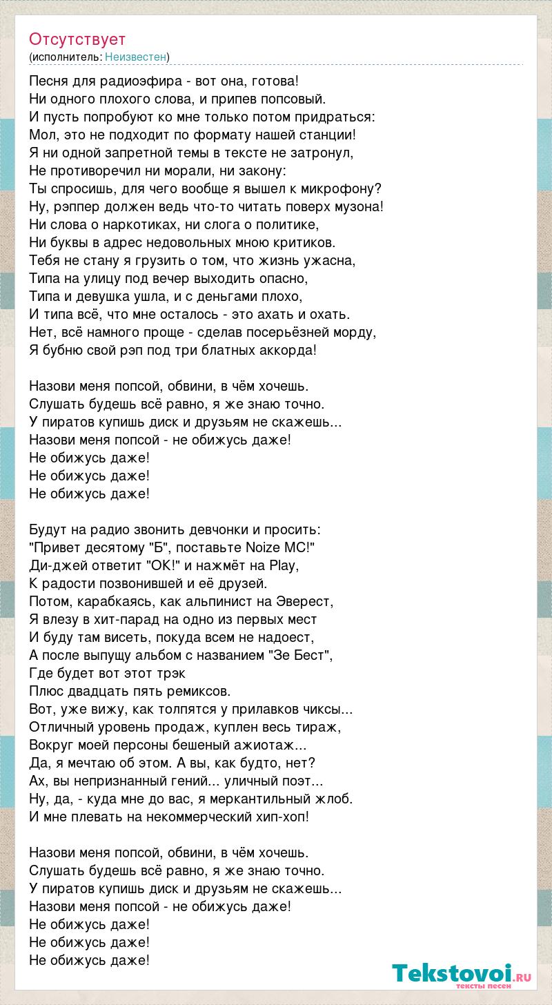 Песня для радиоэфира - вот она, готова! Ни одного плохого слова, и припев попсовый. И пусть попробуют ко мне только потом придраться: Мол, это не подходит по формату нашей станции! Я ни одной запретной темы в тексте не затронул, Не противоречил ни морали, ни закону: Ты спросишь, для чего вообще я вышел к микрофону? Ну, рэппер должен ведь что-то читать поверх музона! Ни слова о наркотиках, ни слога о политике, Ни буквы в адрес недовольных мною критиков. Тебя не стану я грузить о том, что жизнь ужасна, Типа на улицу под вечер выходить опасно, Типа и девушка ушла, и с деньгами плохо, И типа всё, что мне осталось - это ахать и охать. Нет, всё намного проще - сделав посерьёзней морду, Я бубню свой рэп под три блатных аккорда! Назови меня попсой, обвини, в чём хочешь. Слушать будешь всё равно, я же знаю точно. У пиратов купишь диск и друзьям не скажешь... Назови меня попсой - не обижусь даже! Не обижусь даже! Не обижусь даже! Не обижусь даже! Будут на радио звонить девчонки и просить: "Привет десятому "Б", поставьте Noize MC!" Ди-джей ответит "ОК!" и нажмёт на Play, К радости позвонившей и её друзей. Потом, карабкаясь, как альпинист на Эверест, Я влезу в хит-парад на одно из первых мест И буду там висеть, покуда всем не надоест, А после выпущу альбом с названием "Зе Бест", Где будет вот этот трэк Плюс двадцать пять ремиксов. Вот, уже вижу, как толпятся у прилавков чиксы... Отличный уровень продаж, куплен весь тираж, Вокруг моей персоны бешеный ажиотаж... Да, я мечтаю об этом. А вы, как будто, нет? Ах, вы непризнанный гений... уличный поэт... Ну, да, - куда мне до вас, я меркантильный жлоб. И мне плевать на некоммерческий хип-хоп! Назови меня попсой, обвини, в чём хочешь. Слушать будешь всё равно, я же знаю точно. У пиратов купишь диск и друзьям не скажешь... Назови меня попсой - не обижусь даже! Не обижусь даже! Не обижусь даже! Не обижусь даже!