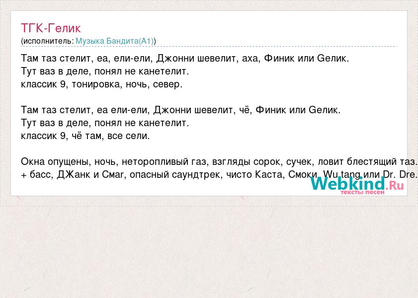 Там таз стелит, еа, ели-ели, Джонни шевелит, аха, Финик или Gелик. Тут ваз в деле, понял не канетелит. классик 9, тонировка, ночь, север. Там таз стелит, еа ели-ели, Джонни шевелит, чё, Финик или Gелик. Тут ваз в деле, понял не канетелит. классик 9, чё там, все сели. Окна опущены, ночь, неторопливый газ, взгляды сорок, сучек, ловит блестящий таз. + басс, ДЖанк и Смаr, опасный саундтрек, чисто Каста, Смоки, Wu tang или Dr. Dre.