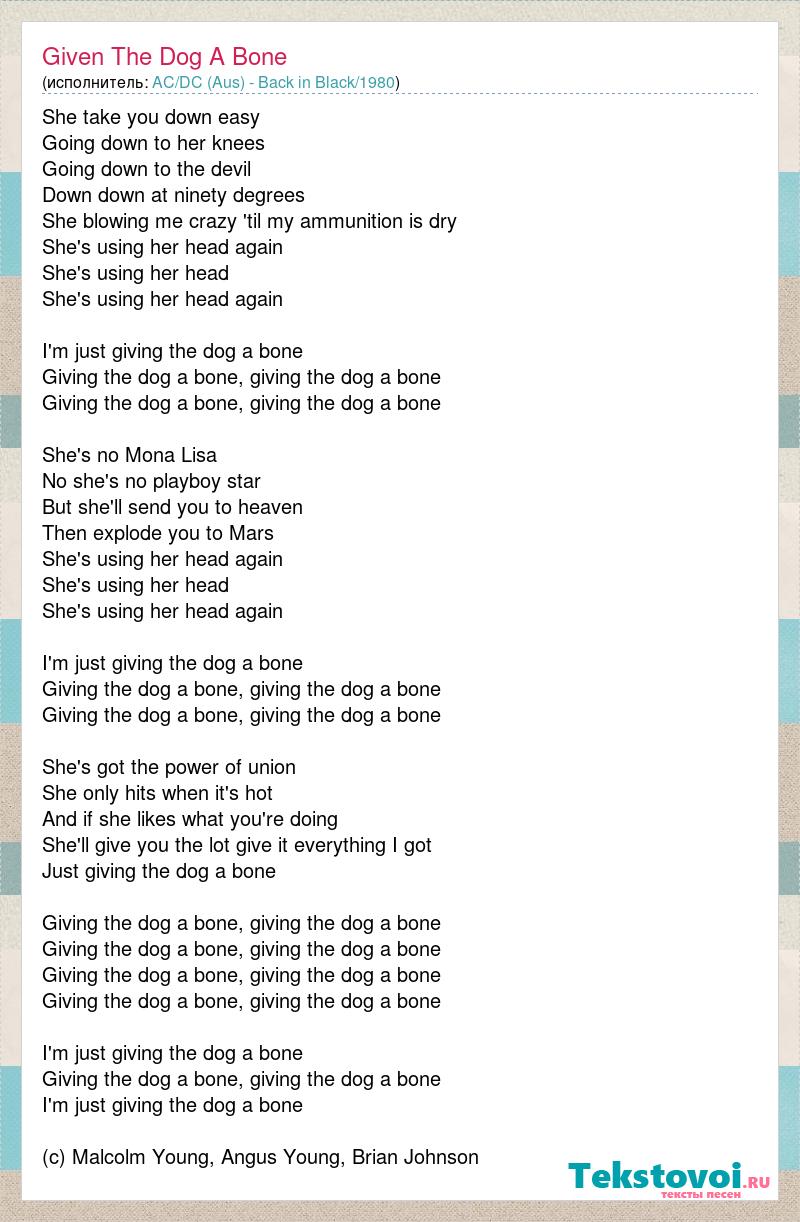 She take you down easy Going down to her knees Going down to the devil Down down at ninety degrees She blowing me crazy 'til my ammunition is dry She's using her head again She's using her head She's using her head again I'm just giving the dog a bone Giving the dog a bone, giving the dog a bone Giving the dog a bone, giving the dog a bone She's no Mona Lisa No she's no playboy star But she'll send you to heaven Then explode you to Mars She's using her head again She's using her head She's using her head again I'm just giving the dog a bone Giving the dog a bone, giving the dog a bone Giving the dog a bone, giving the dog a bone She's got the power of union She only hits when it's hot And if she likes what you're doing She'll give you the lot give it everything I got Just giving the dog a bone Giving the dog a bone, giving the dog a bone Giving the dog a bone, giving the dog a bone Giving the dog a bone, giving the dog a bone Giving the dog a bone, giving the dog a bone I'm just giving the dog a bone Giving the dog a bone, giving the dog a bone I'm just giving the dog a bone (с) Malcolm Young, Angus Young, Brian Johnson