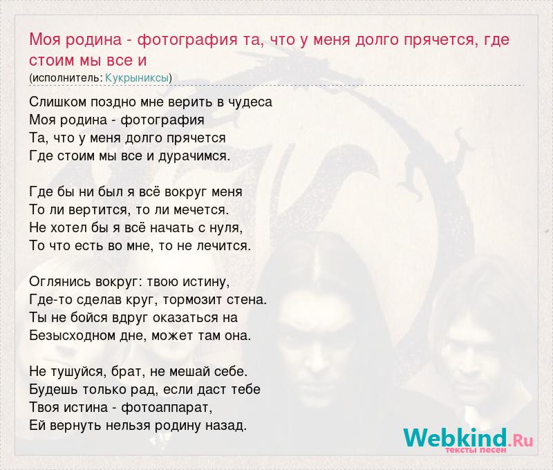 Слишком поздно мне верить в чудеса Моя родина - фотография Та, что у меня долго прячется Где стоим мы все и дурачимся. Где бы ни был я всё вокруг меня То ли вертится, то ли мечется. Не хотел бы я всё начать с нуля, То что есть во мне, то не лечится. Оглянись вокруг: твою истину, Где-то сделав круг, тормозит стена. Ты не бойся вдруг оказаться на Безысходном дне, может там она. Не тушуйся, брат, не мешай себе. Будешь только рад, если даст тебе Твоя истина - фотоаппарат, Ей вернуть нельзя родину назад.
